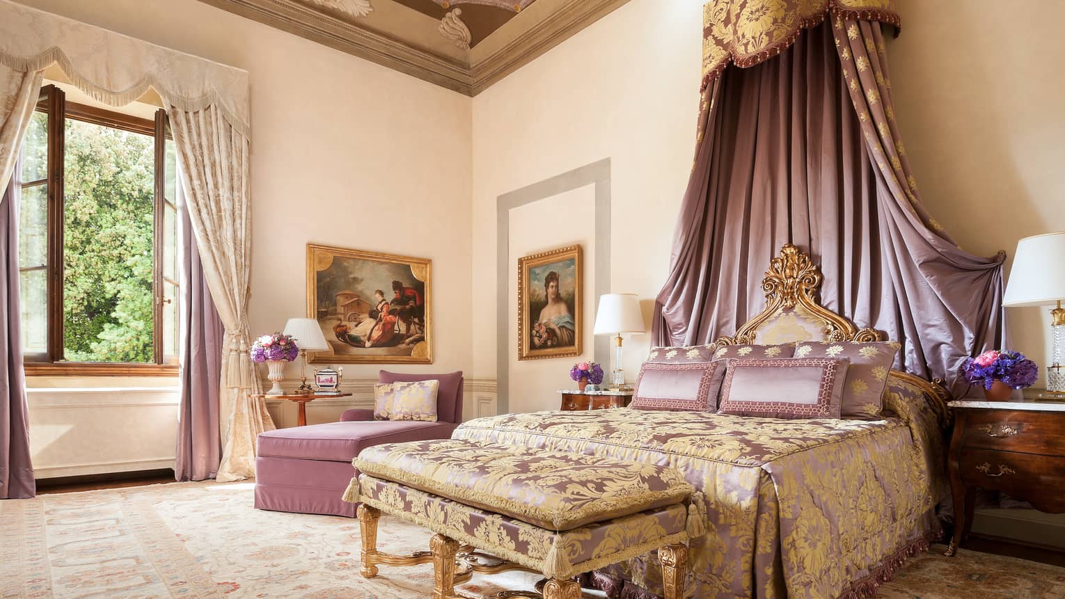 La suite real del Four Seasons de Florencia está ubicada junto a los jardines botánicos de Giardino della Gherardesca. Completamente decorada con yeserías ornamentadas y frescos que recuerdan la rica historia del arte de Florencia. Estas habitaciones amplias y luminosas también cuentan con una decoración de inspiración renacentista, así como con comodidades más modernas, y le costarán a los viajeros más de 16.000 euros por noche para permanecer en esta suite palaciega.