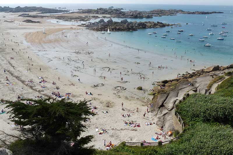 Esta magnífica playa de arena blanca y fina con sus aguas turquesas recuerda a las playas de las Seychelles. Es perfecta para construir castillos de arena, está vigilada en verano. Es una playa perfecta para familias con niños y el oleaje no es muy grande. Se dice que en Bretaña hay 4 estaciones en un día porque puede llover y hacer mucho sol unos minutos más tarde. El cambio de tiempo cambia totalmente el aspecto de esta playa, cuya arena parece aún más blanca y las aguas aún más turquesas cuando el sol brilla en el cielo de Bretaña.