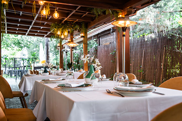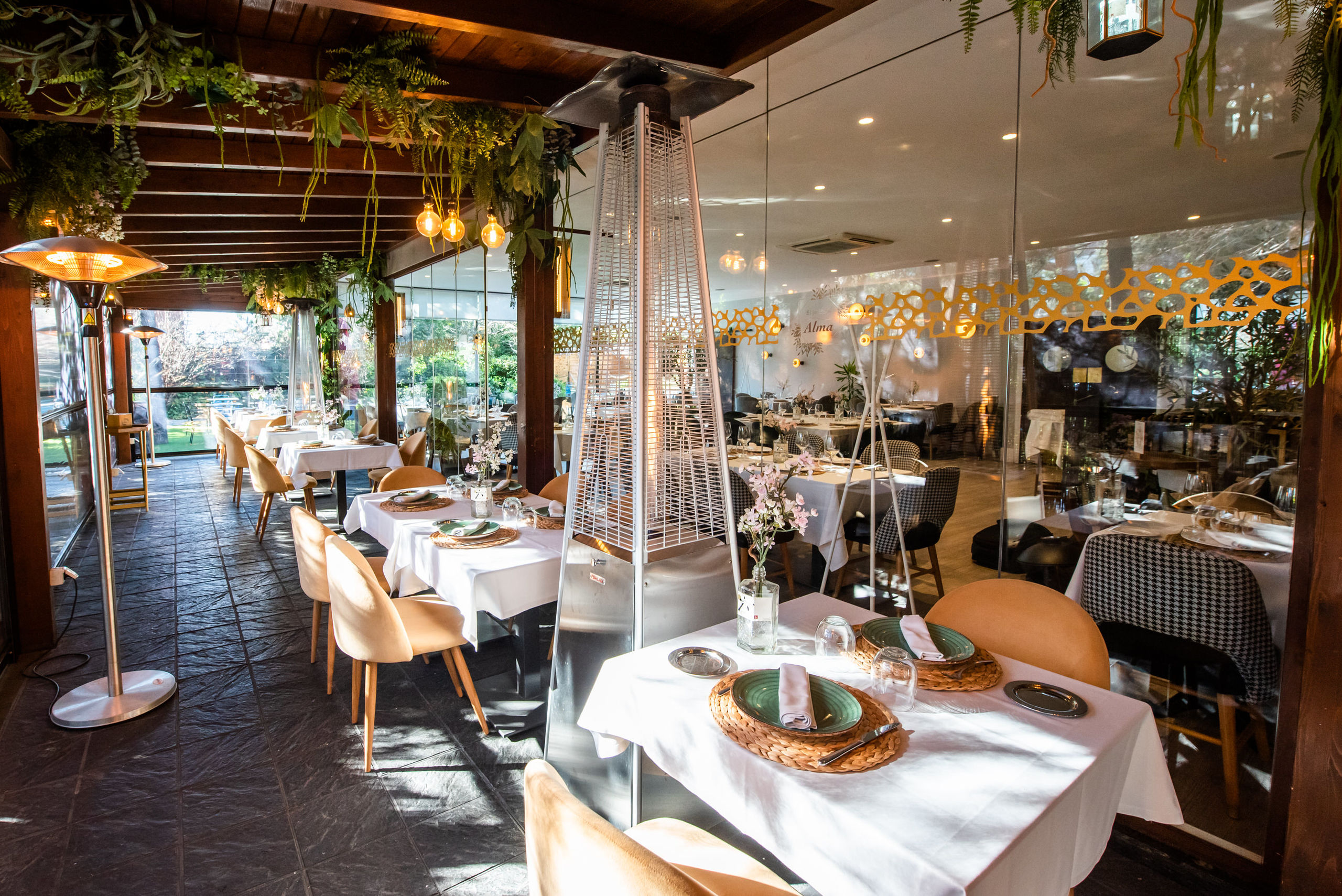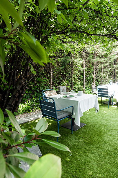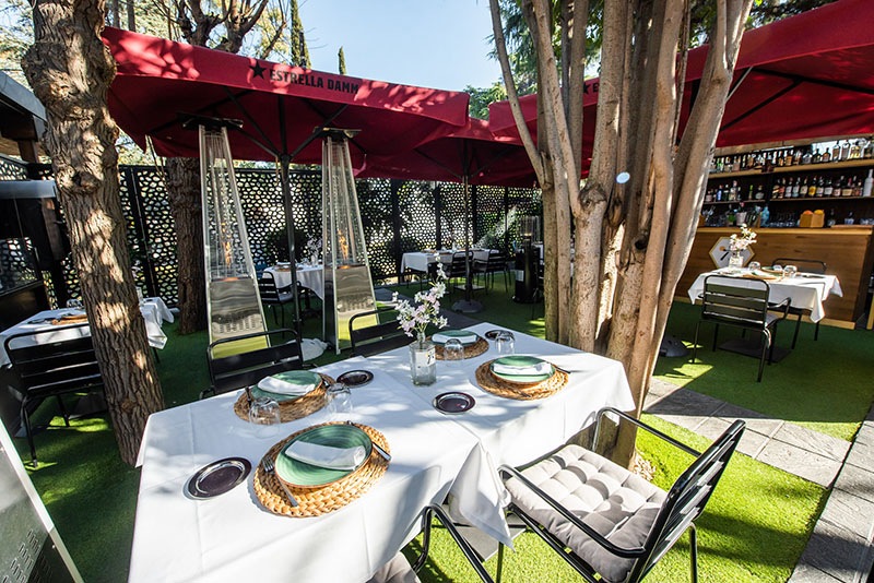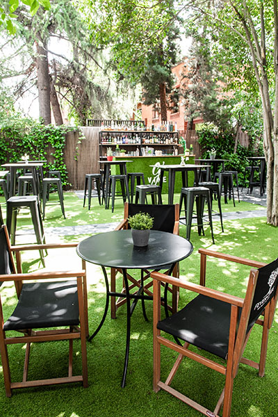 Mesas en la zona trasera del jardín, un auténtico vergel en Madrid.