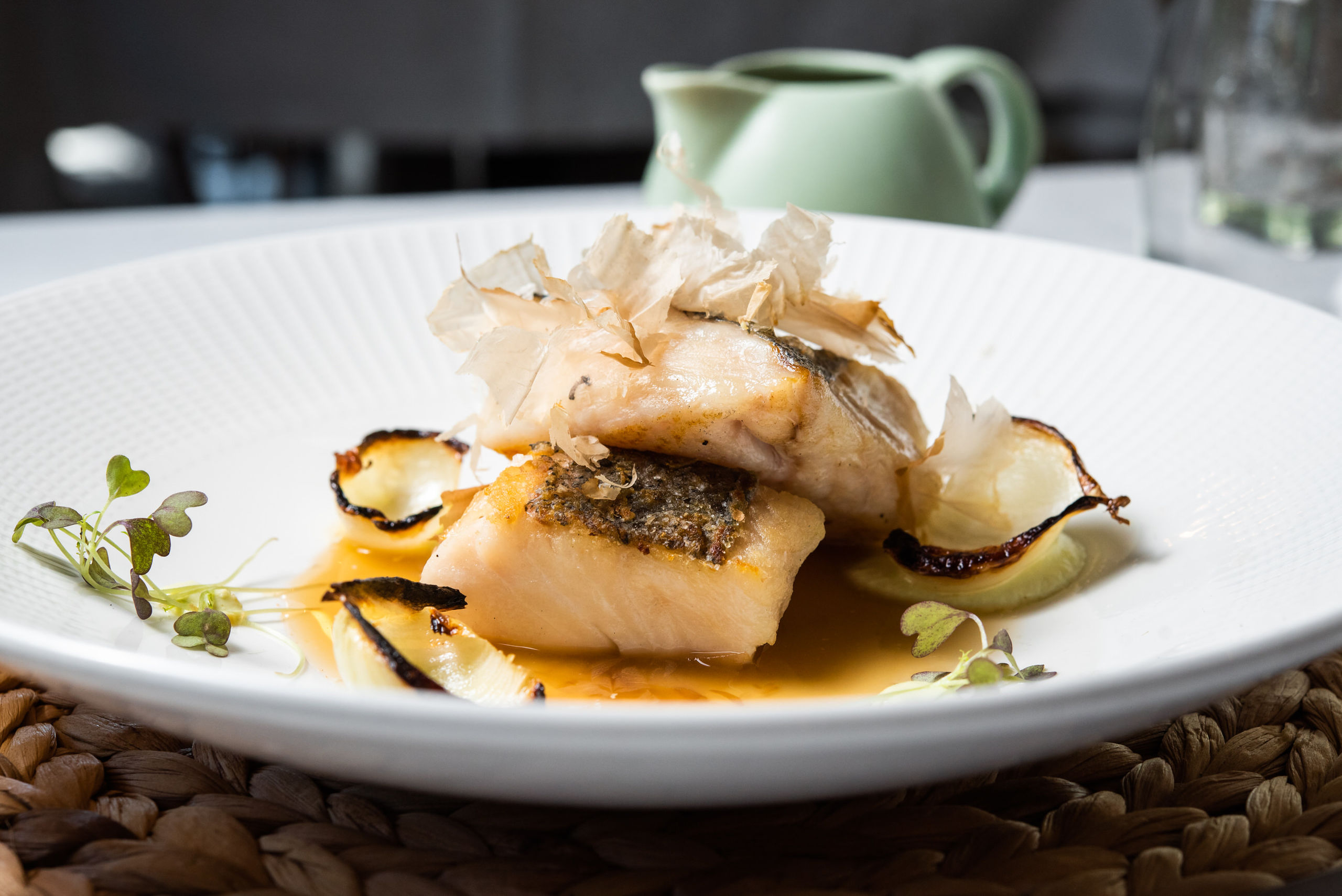 Lomo de lubina sobre crema de cebolla dulce y crujiente de puerro.