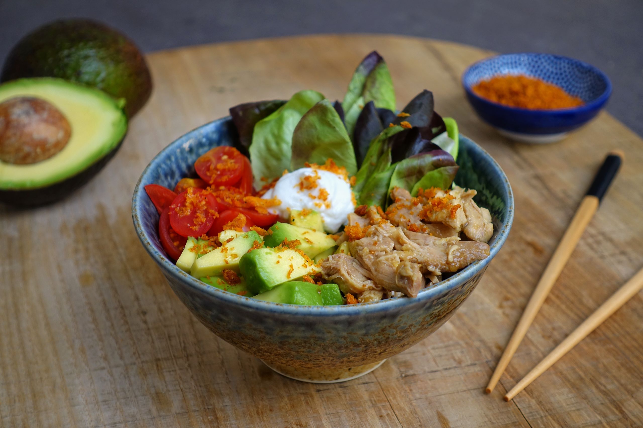 Chicken Poke, con base de arroz, pollo marinado al estilo japonés, aguacate, rúcula, crema de queso, mexican mayo, vinagreta cítrica y smoky panko.