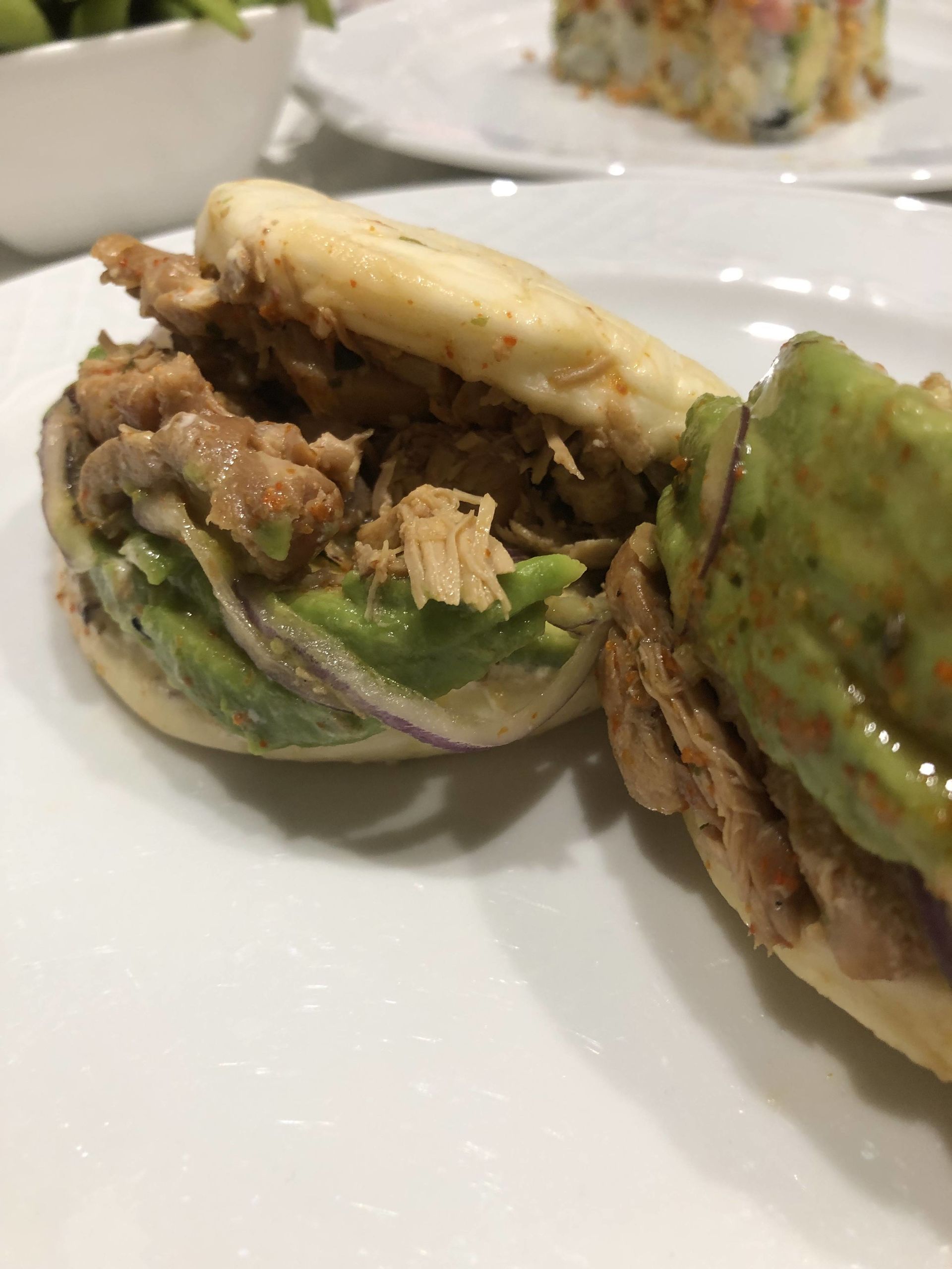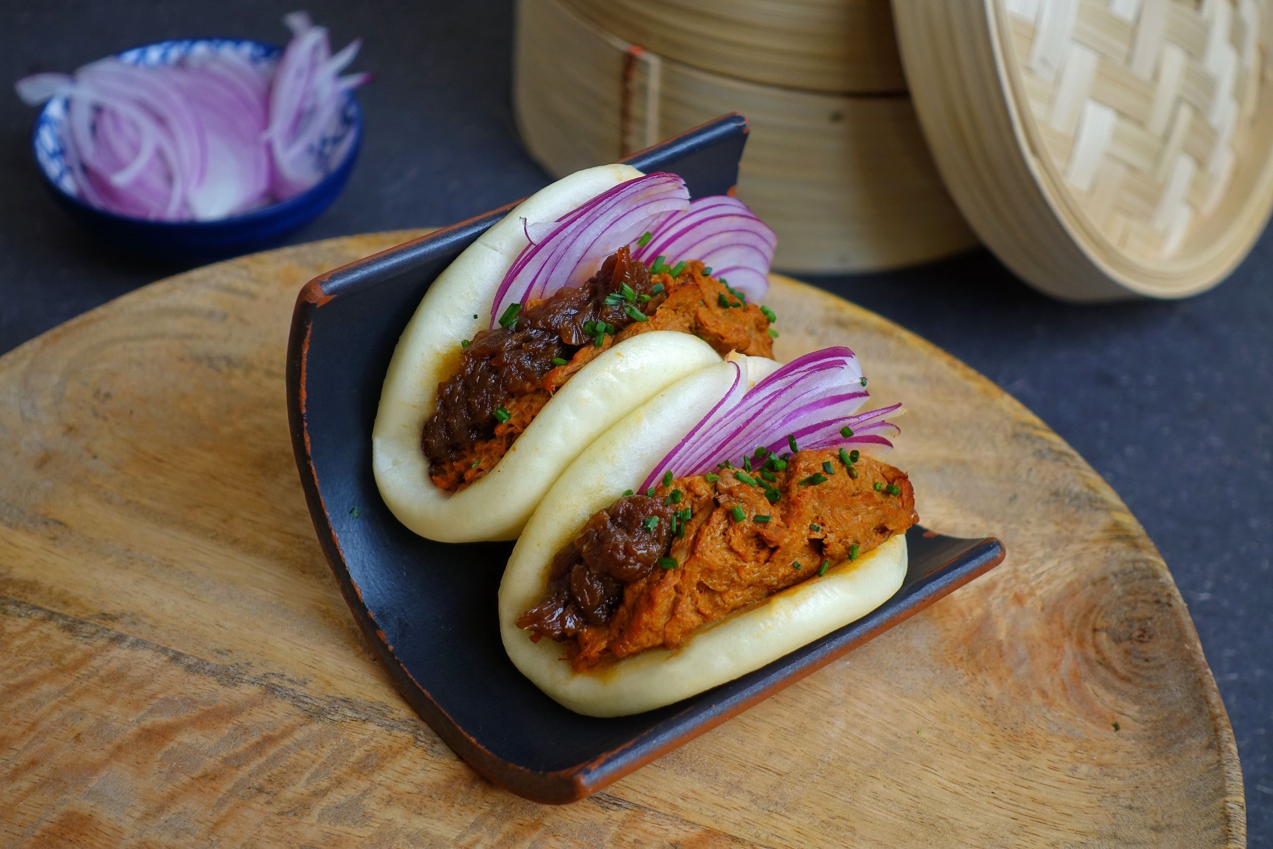 Pork bao, dos bollitos asiáticos de pan al vapor con pulled pork, cebolla caramelizada, cebolla morada, salsa bravacoa, smoky panko y cebollino.