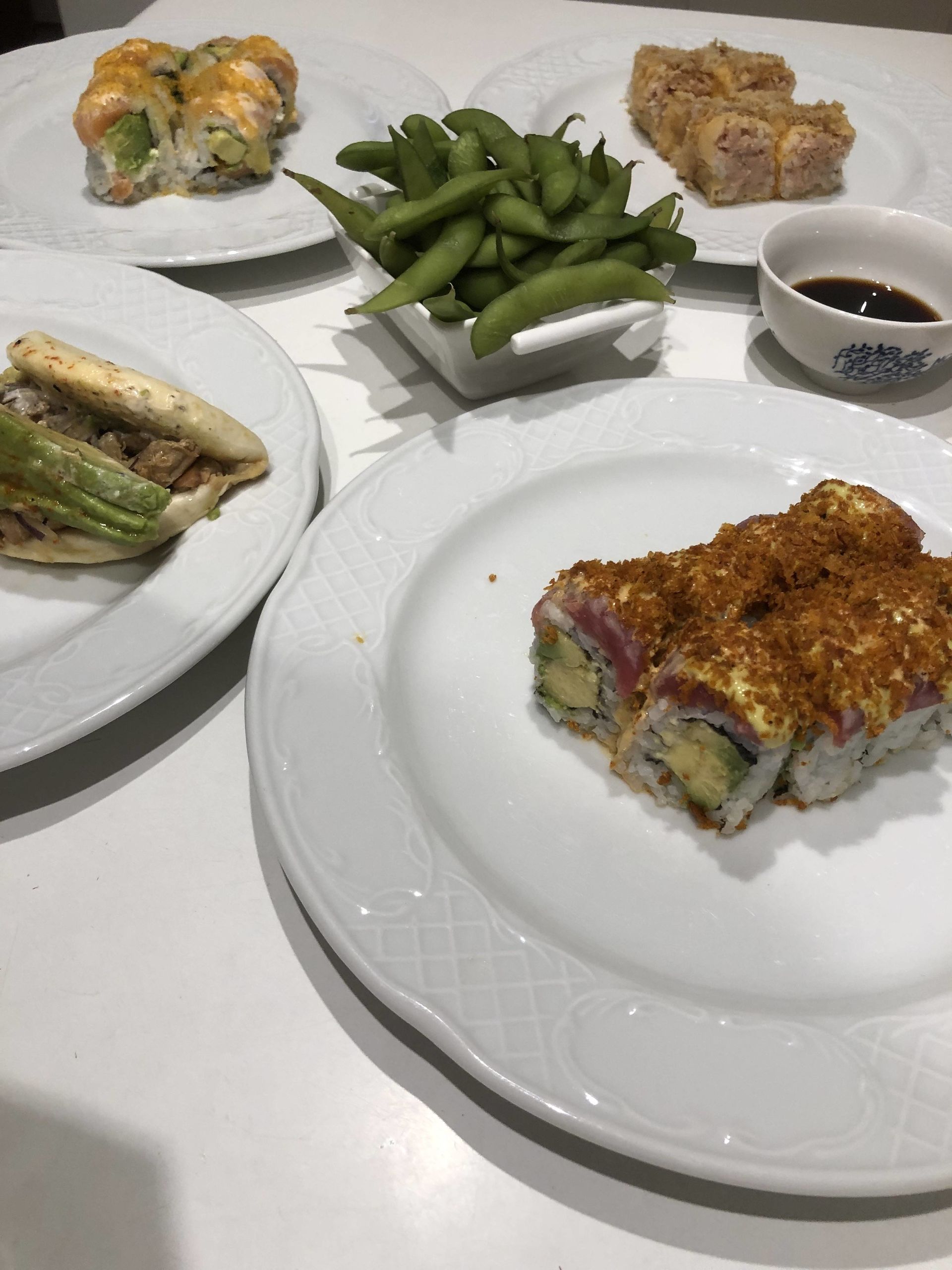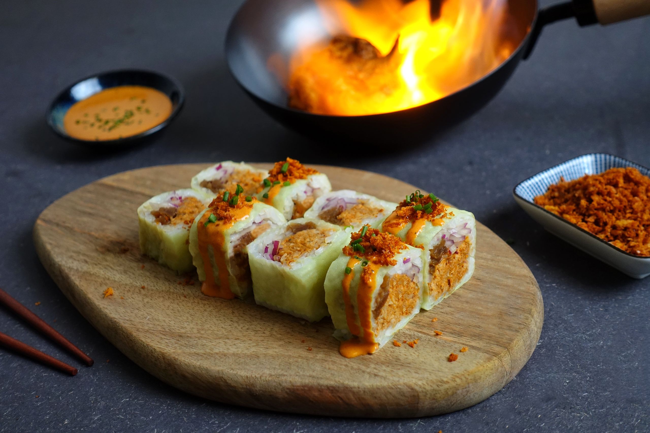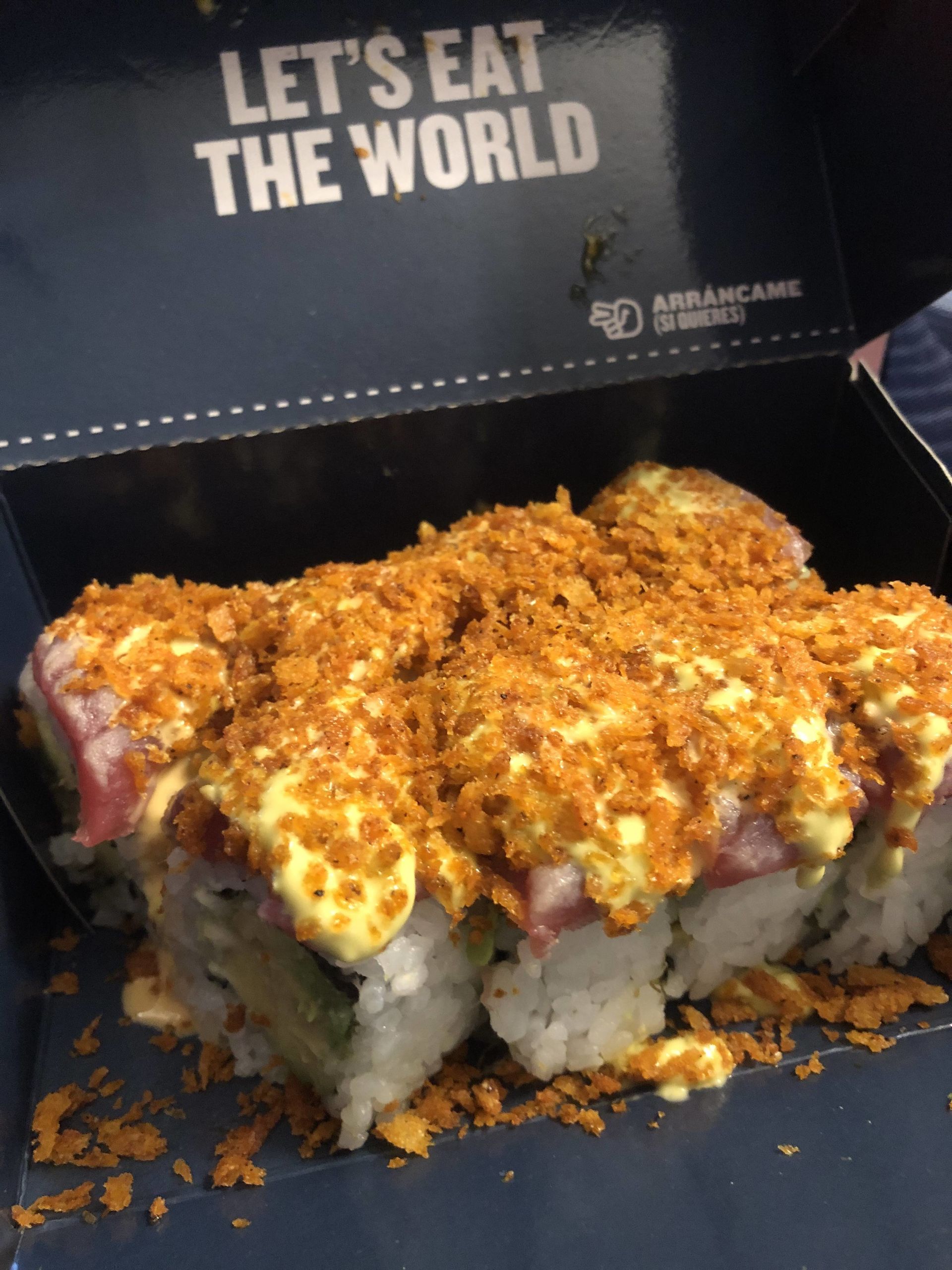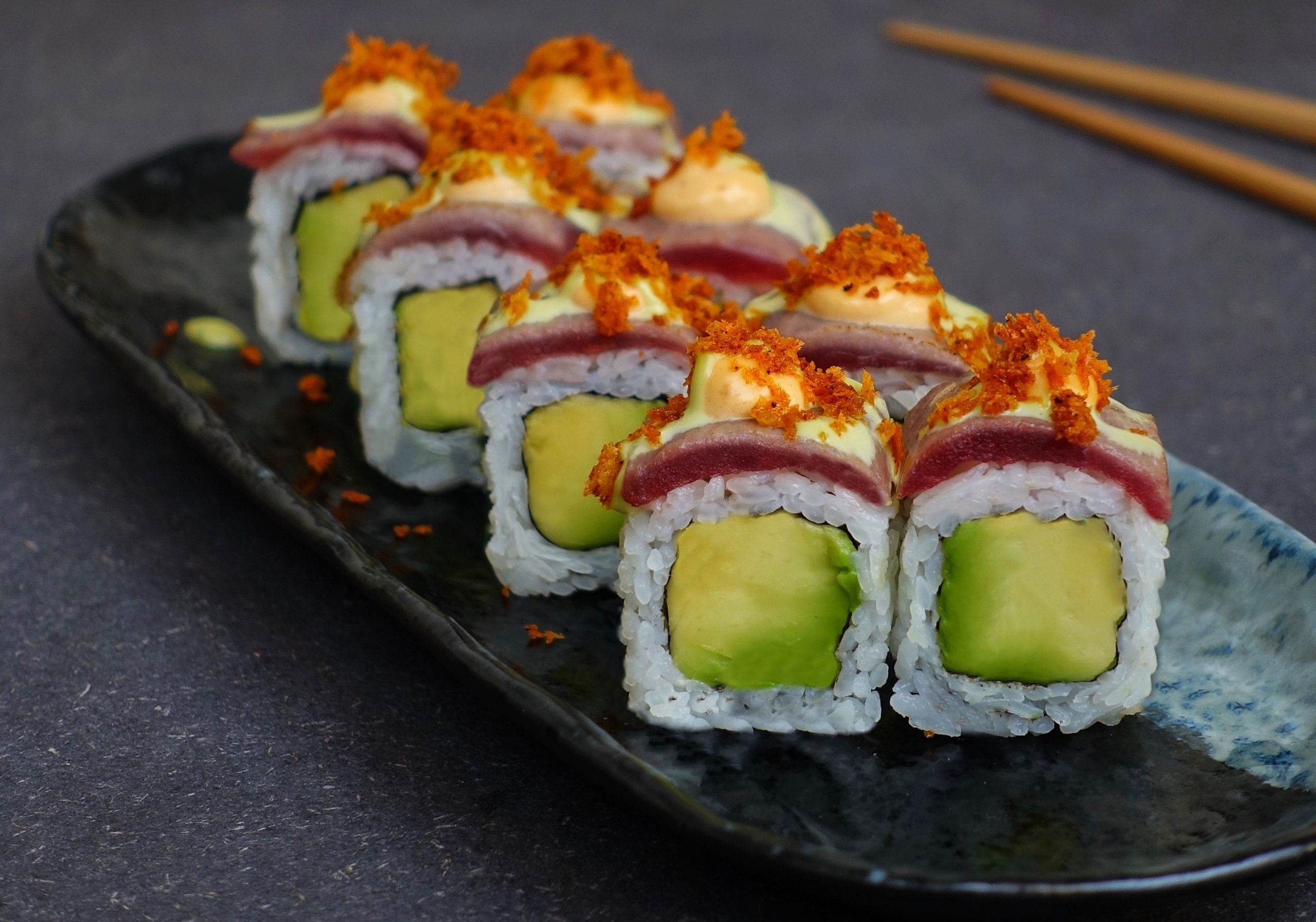 Roll Yucatán, con aguacate envuelto de atún flambeado, salsa mex, mayonesa cítrica y smoky panko.