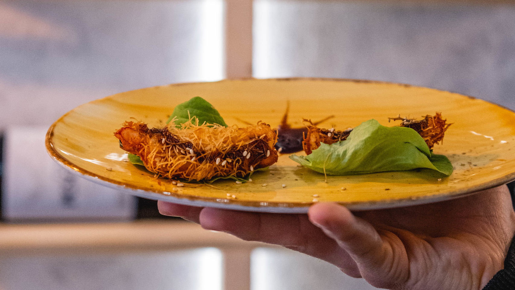 Entre sorbo y sorbo vienen unas maravillosas y nada grasientas gambas envueltas en kataifi (4,90€), para comerlas con las manos envueltas en la hoja de lechuga y con el siempre refrescante toque de la menta. Para comerse más de dos.