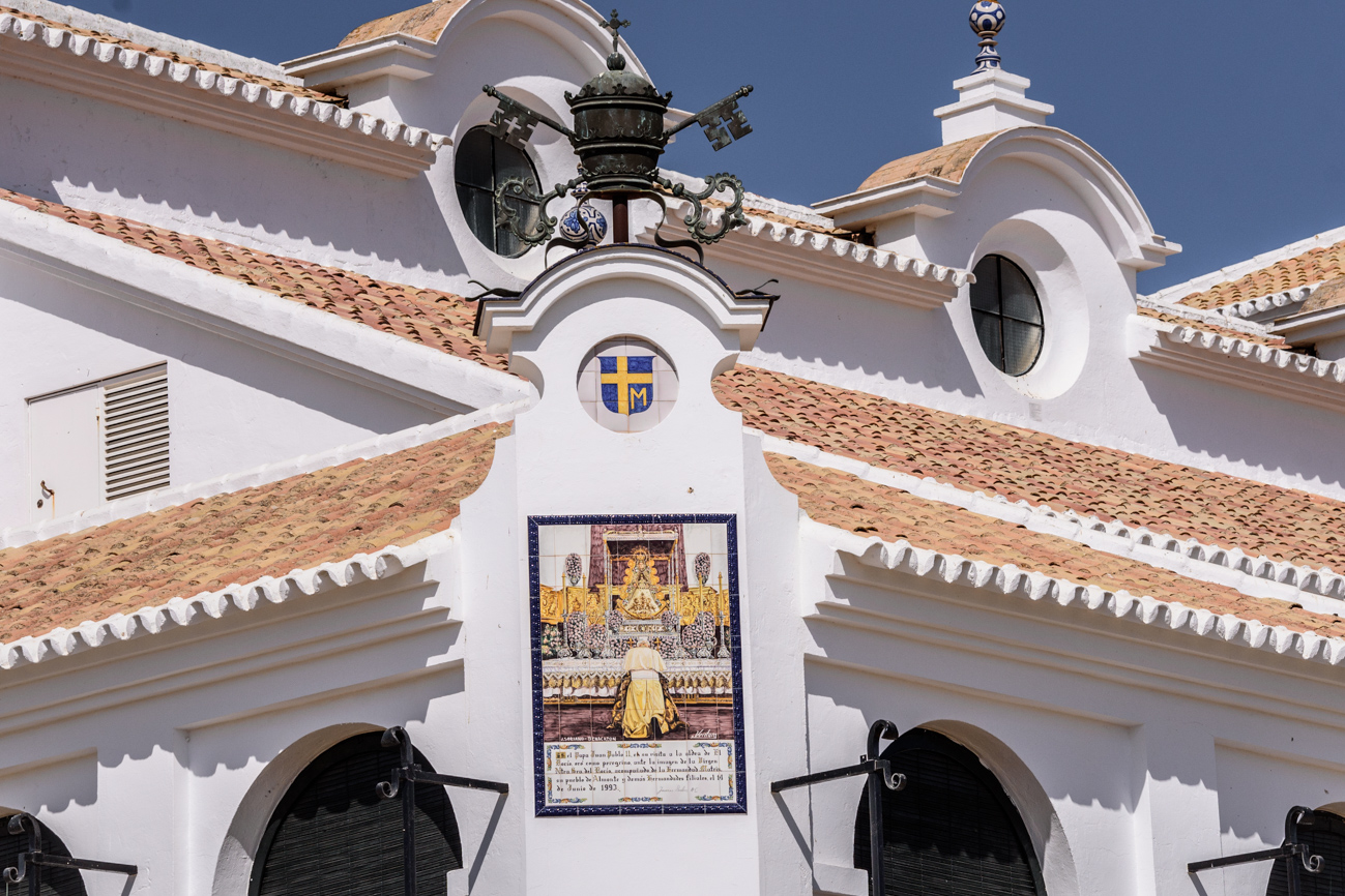 La imagen y los símbolos religiosos de la fachada de la Ermita del Rocío.