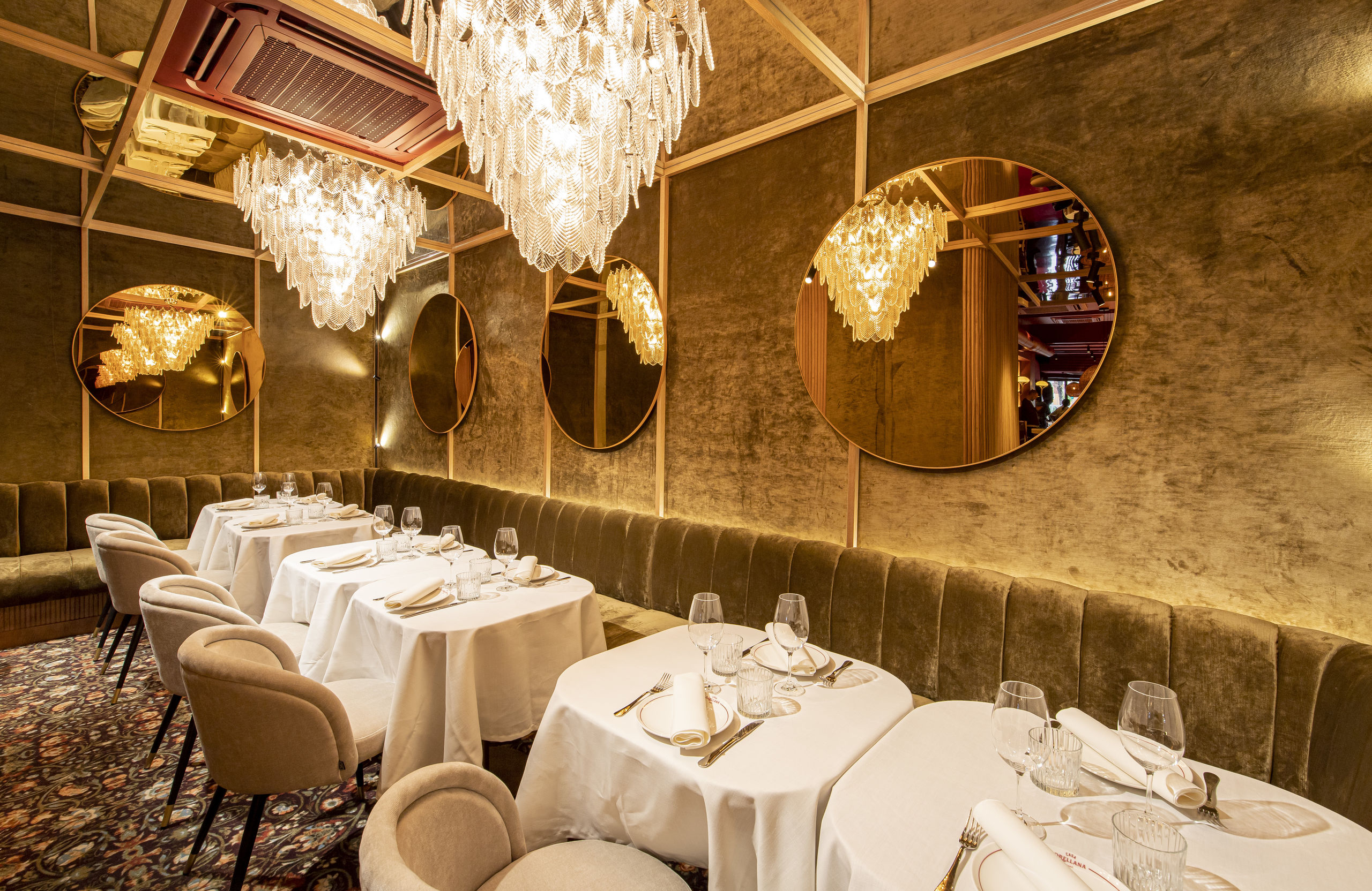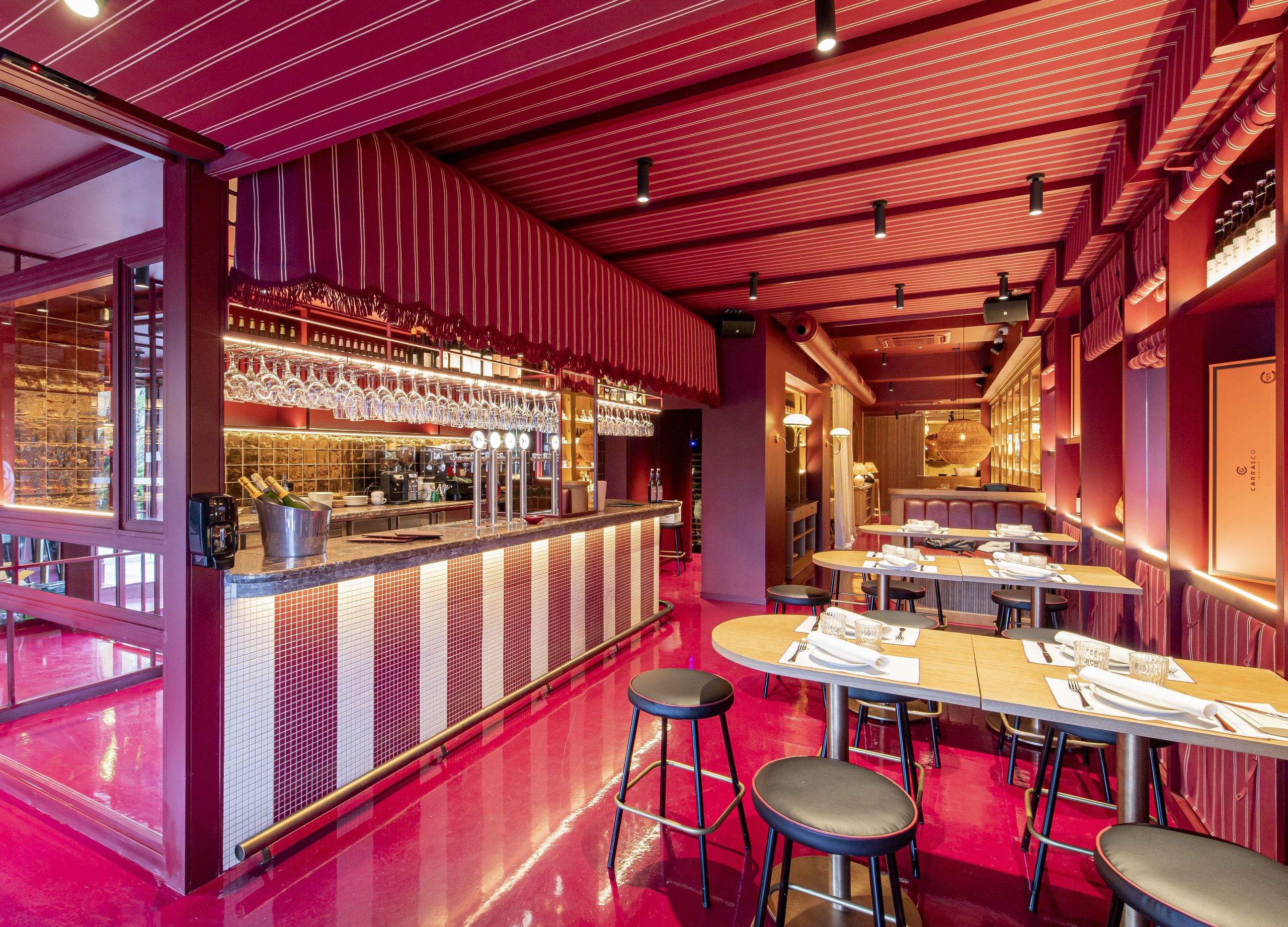 La decoración de esta taberna refinada destaca por su elegancia y buen gusto, con grandes lámparas colgantes, paredes repletas de conservas y botellas de vino y manteniendo el color burdeos santo y seña de la casa que hace de cada sala un lugar especial en el que disfrutar de la propuesta gastronómica del chef Guillermo Salazar.