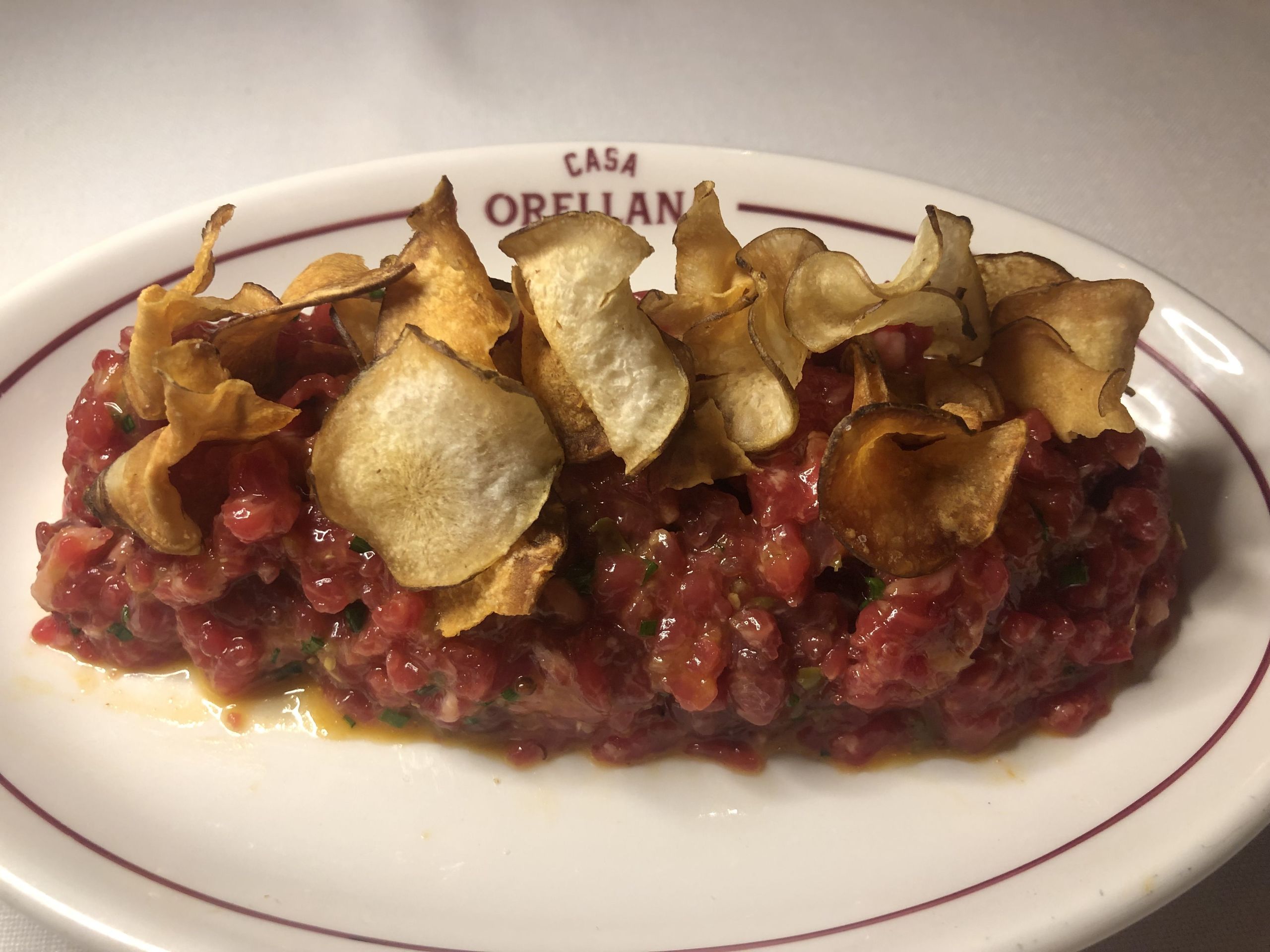 Recuperado el espíritu tabernario de los madrileños, en Casa Orellana puedes disfrutar de una amplia carta y con esa maravilla que cada vez más restaurantes implementan de las medias raciones, aquí incluso tienen el concepto de 'tapa'. De picoteo para acompañar la caña o el vermut tienes la gilda Orellana (4€), la ensaladilla de centolla (T. 8€, M. 11€, E. 18€), una buenas croquetas de rabo de todo (3€ unidad) o los torreznos (T. 5€, M. 7€, E. 10€), entre otras cosas, como el mollete de "pringá", la novedad del de calamares a la andaluza y mayonesa de ajos asados o la hamburguesa de vaca madurada.