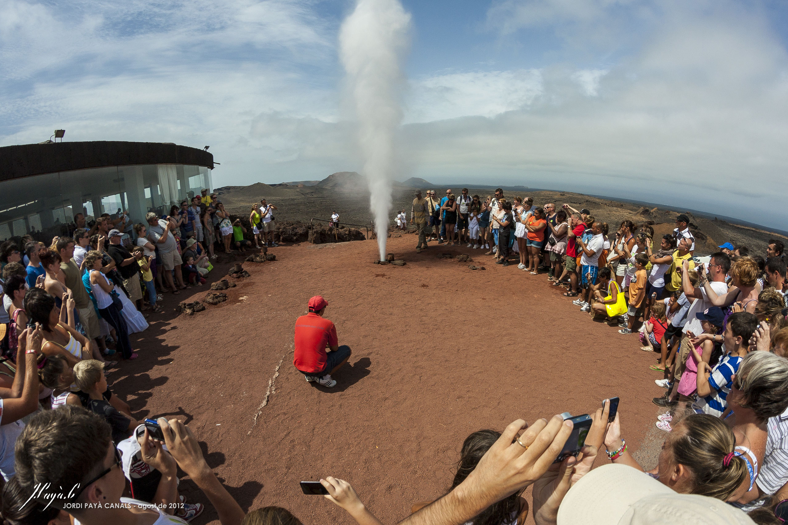 El Parque Nacional de Timanfaya cuenta con un paisaje deslumbrante, casi lunar, colores intensos, volcanes inactivos y, una de las cosas que más llama la atención a la mayoría de los turistas, la posibilidad de contemplar la demostración de un géiser. Un simple vaso de agua introducido en un agujero del suelo basta para que, en pocos segundos, salga un tremendo chorro de vapor de agua, un auténtico géiser.