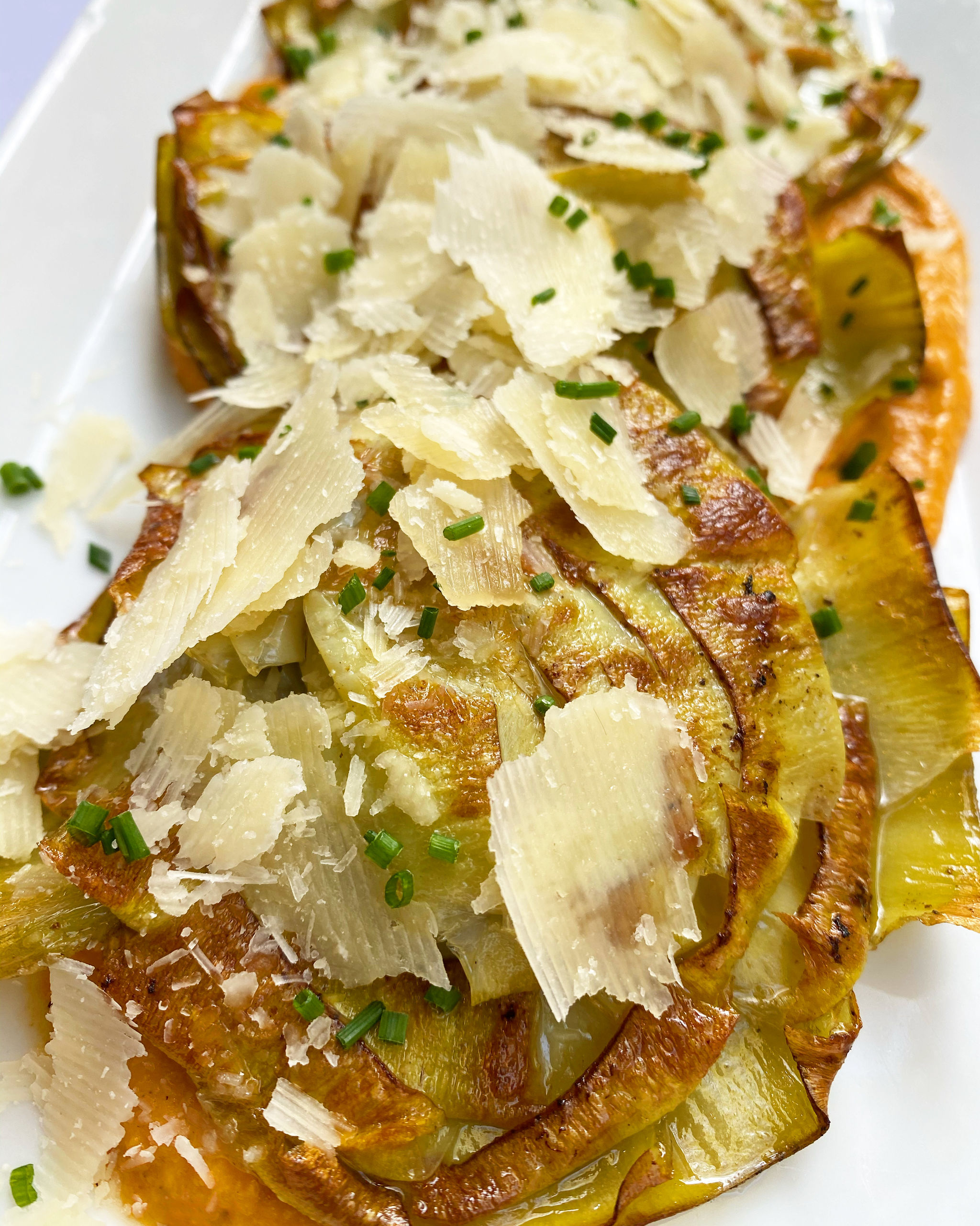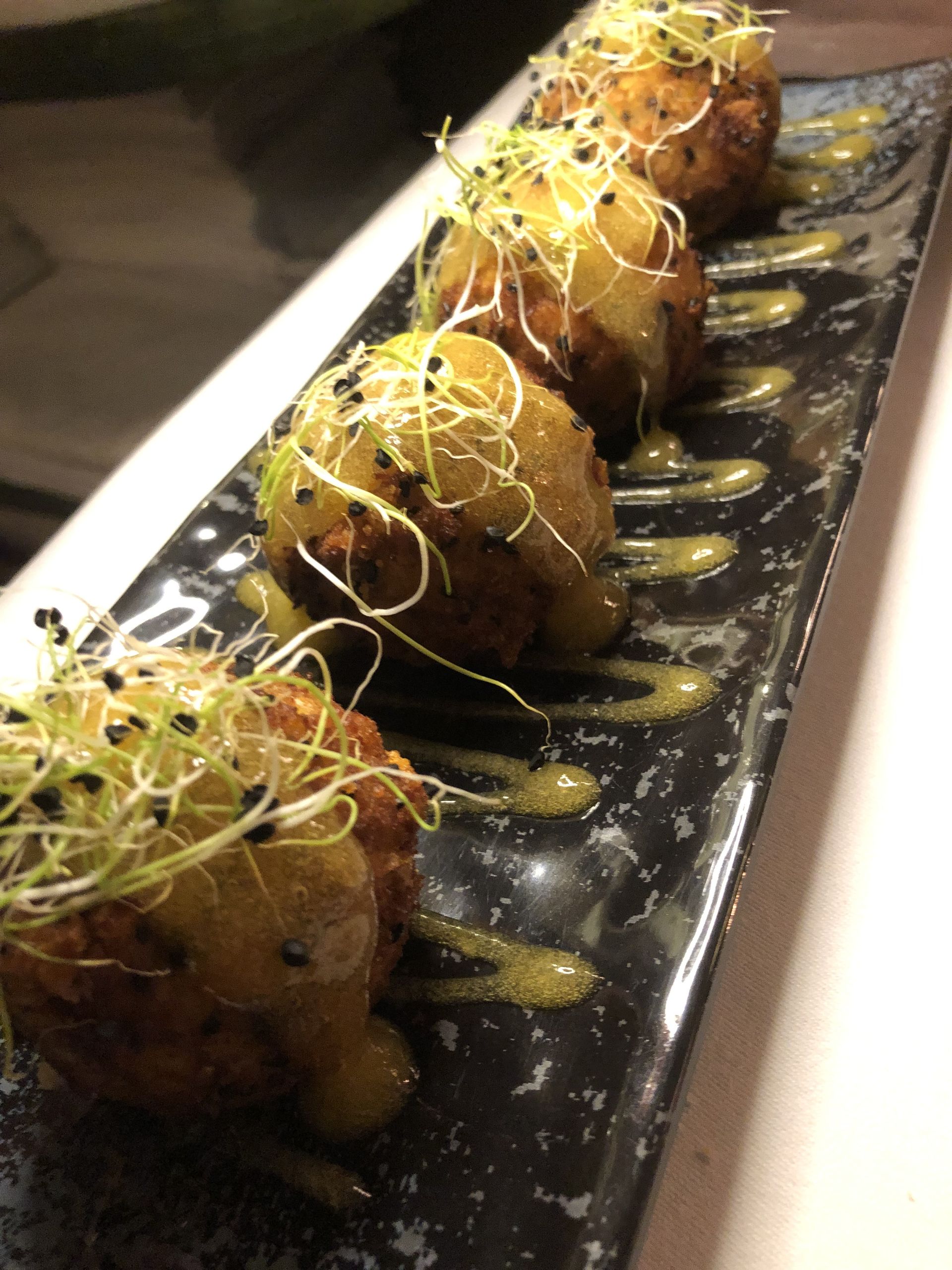 Croquetas de queso de cabra y frutos secos con miel y melocotón.
