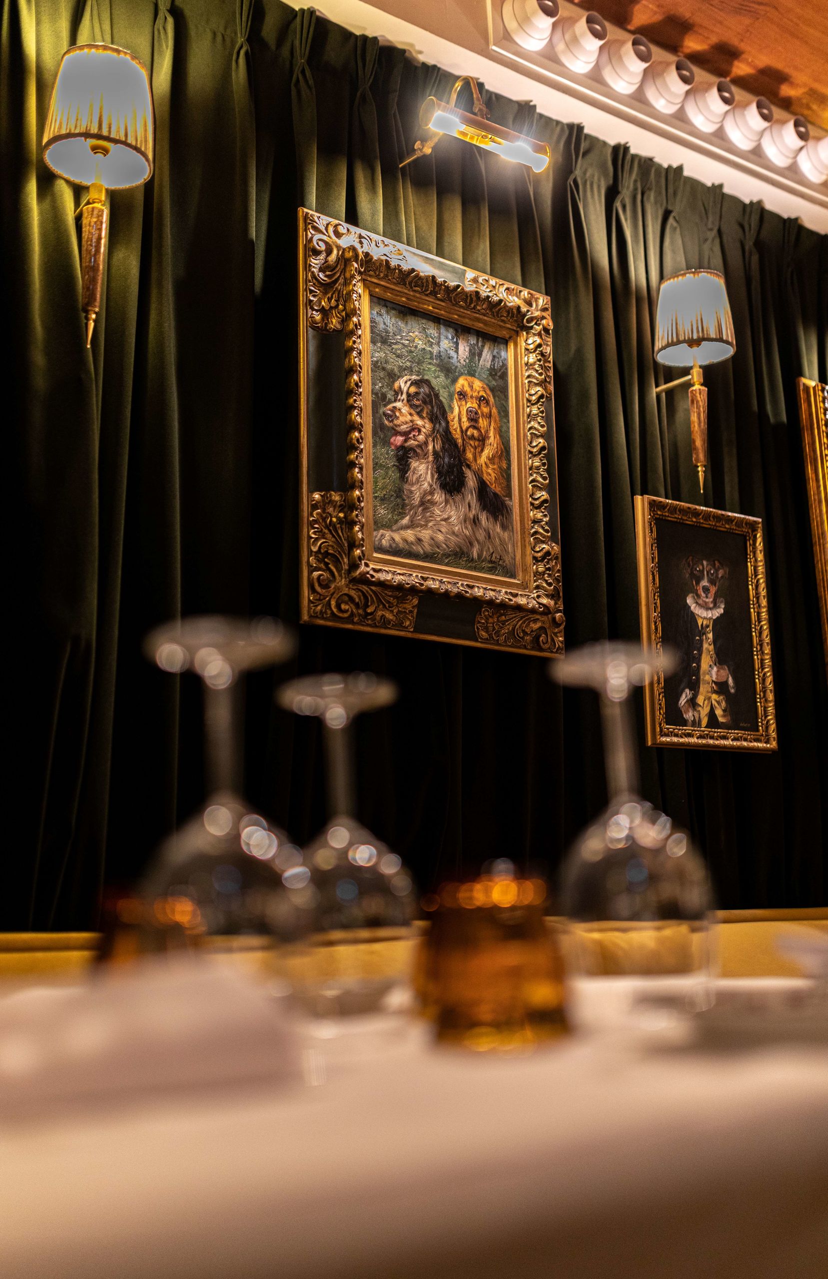 Los cuadros con perros vestidos sustituyen a los clásicos de grandes generales y personajes ilustres.