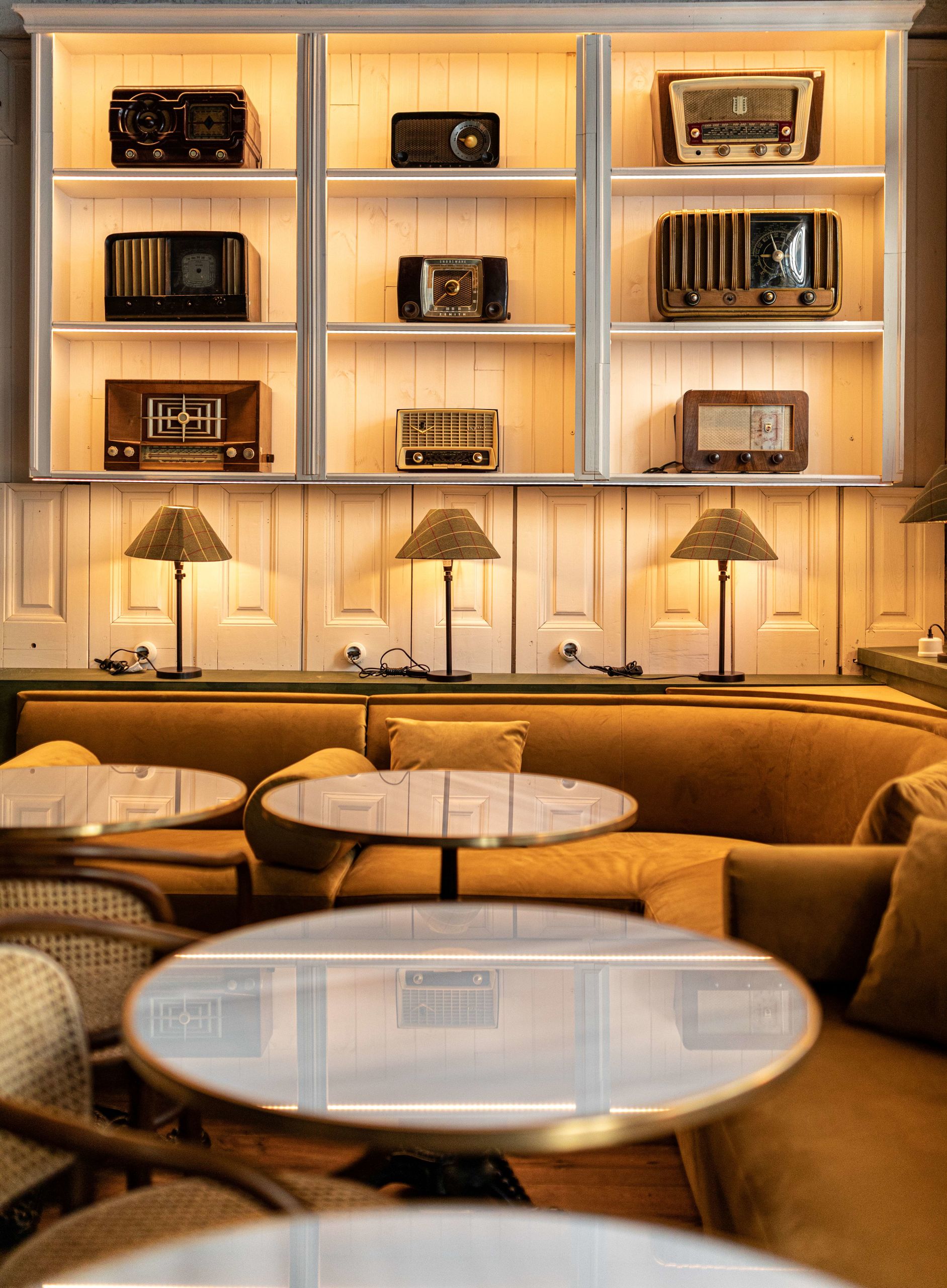 Una de las paredes de El Perro y La Galleta con varias reproducciones de radios antiguas.