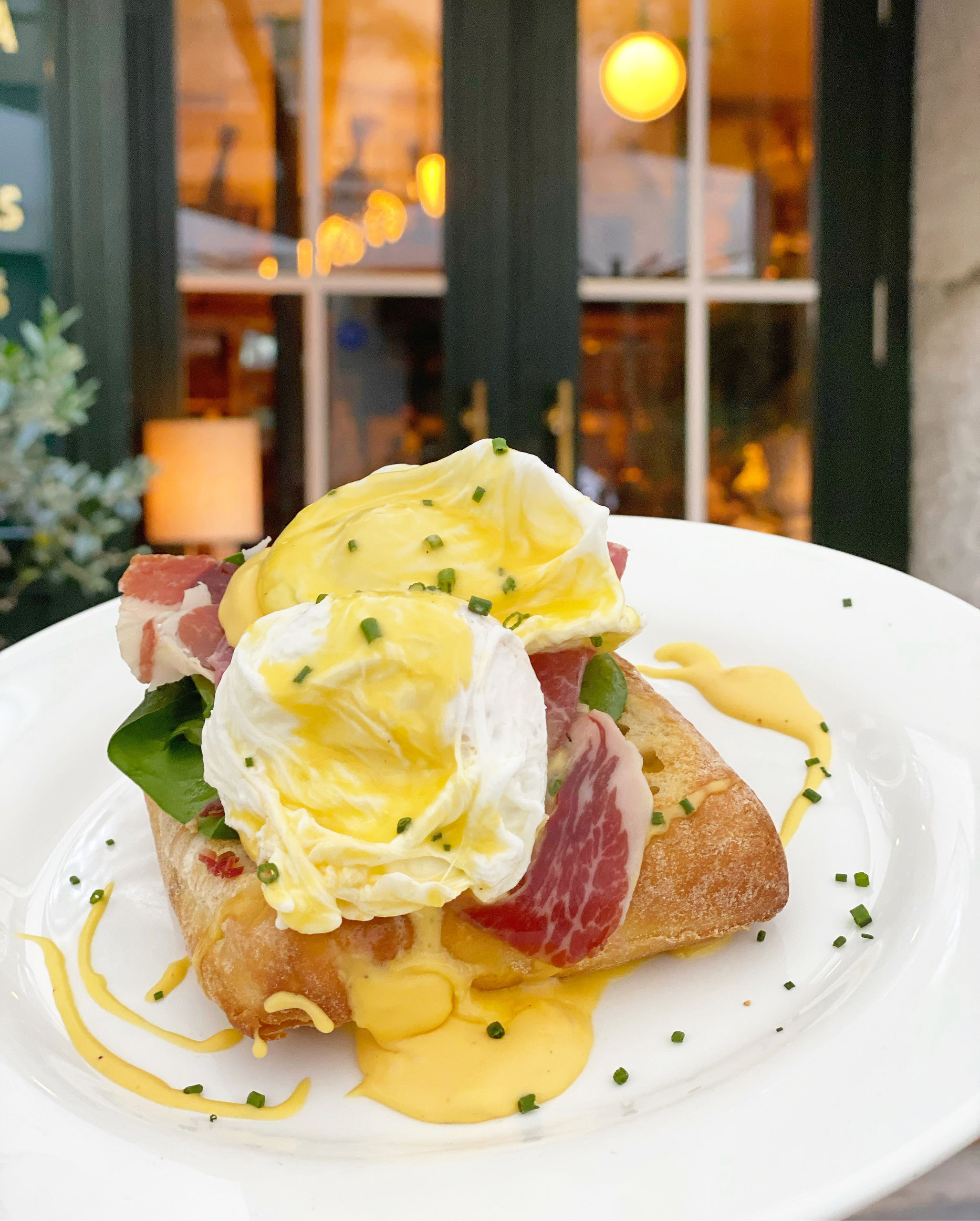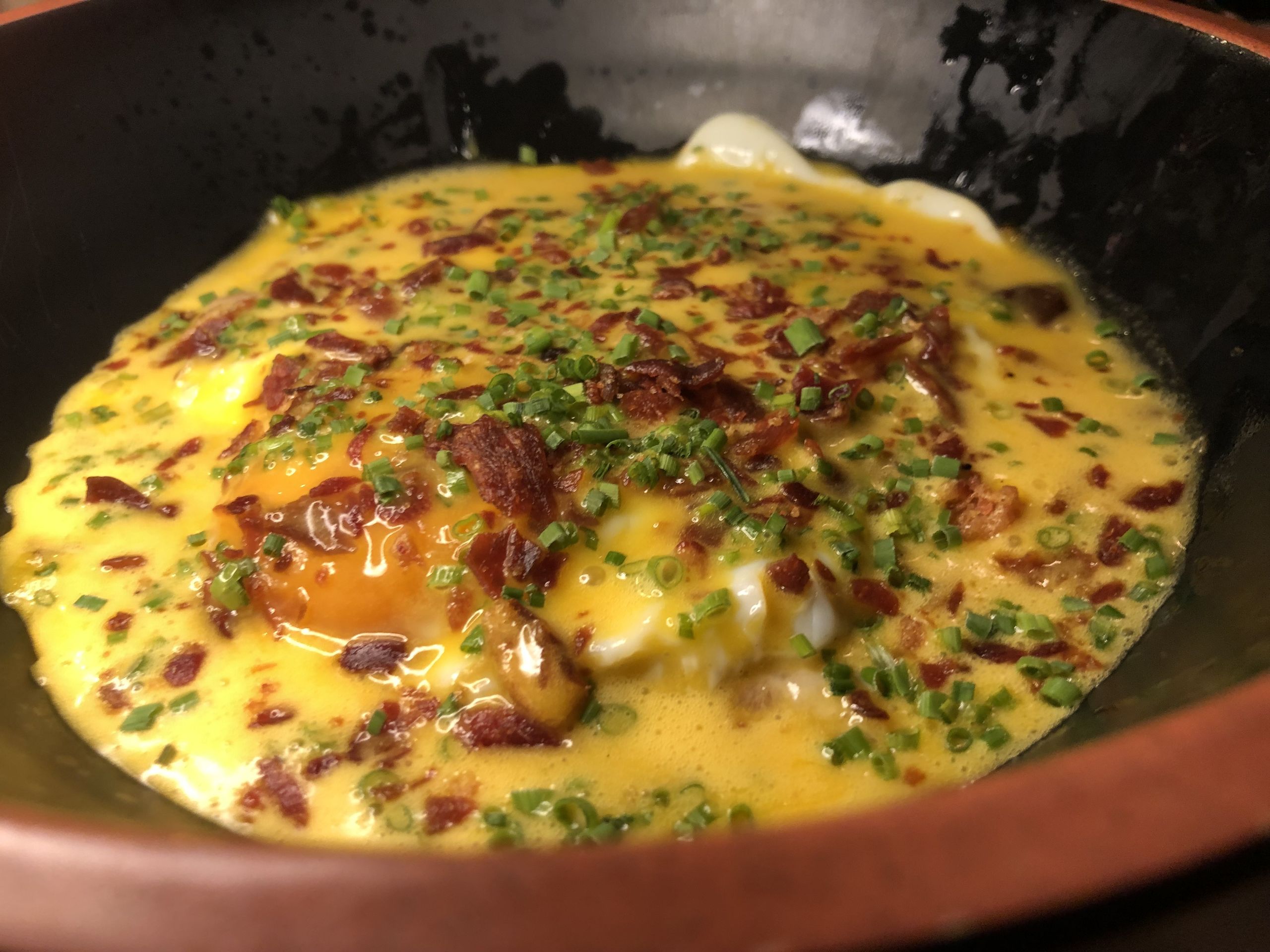 Bol de tartar de salmón con guacamole y huevo frito con crujiente de jamón y papas con salsa holandesa.