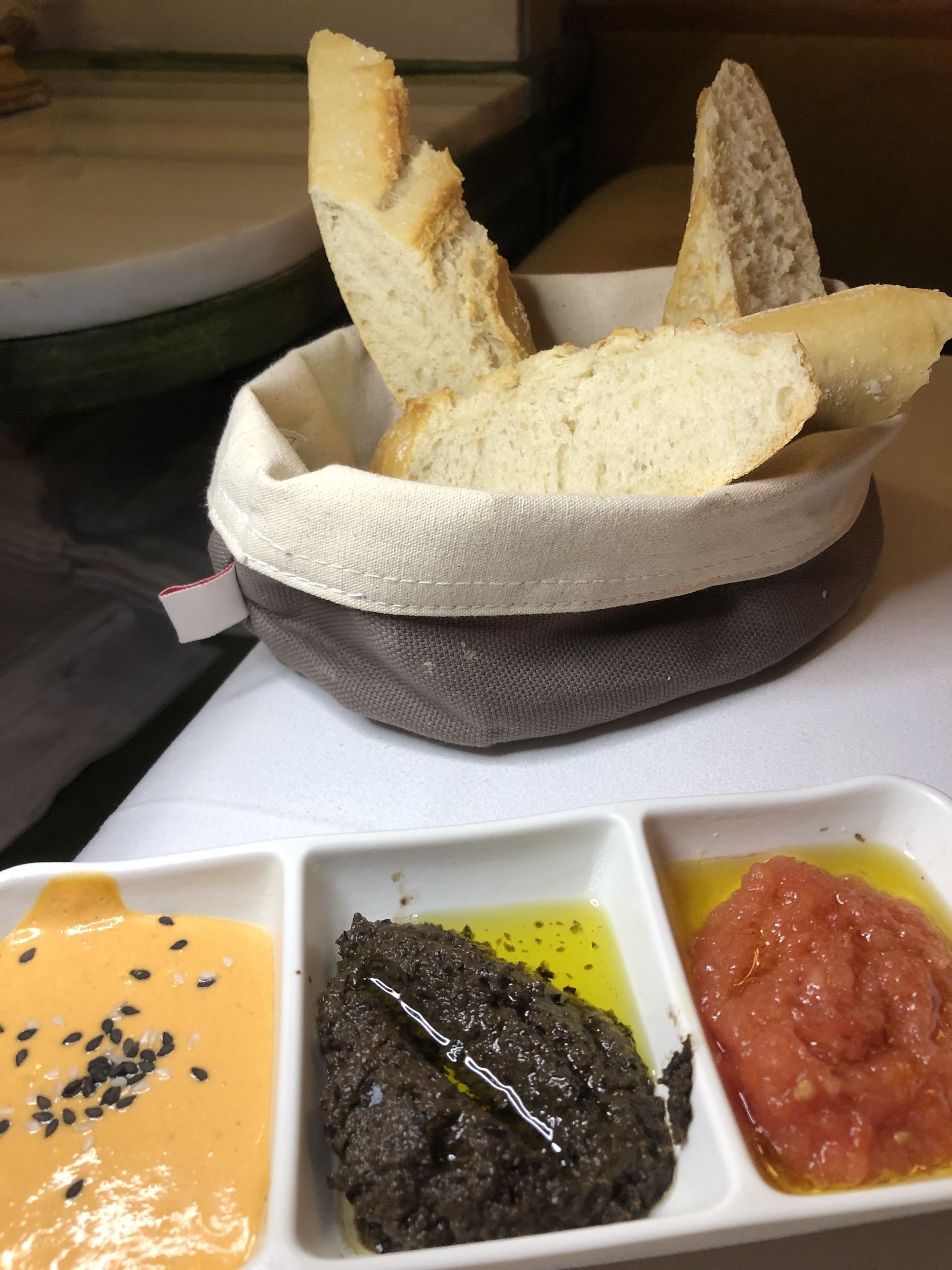 Aperitivo de tres salsas: de pimiento rojo, mantequilla y queso, tapenade y de tomate, para acompañarlo con pan y un buen AOVE.