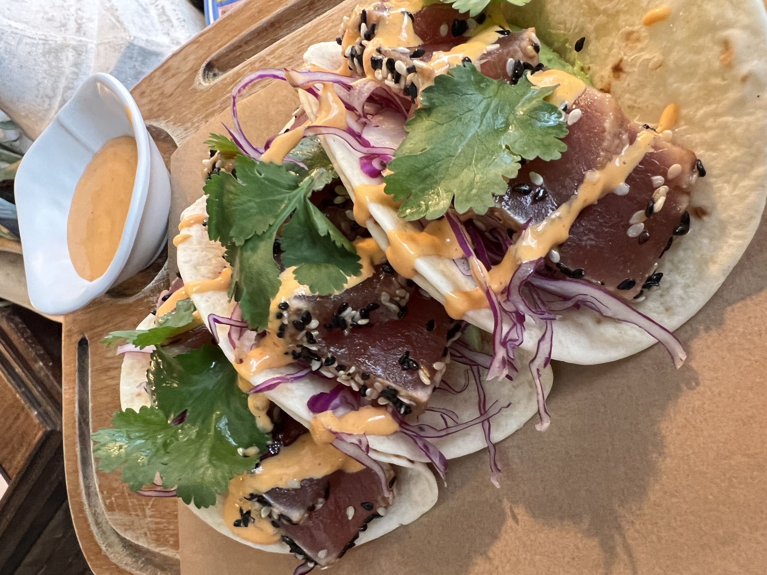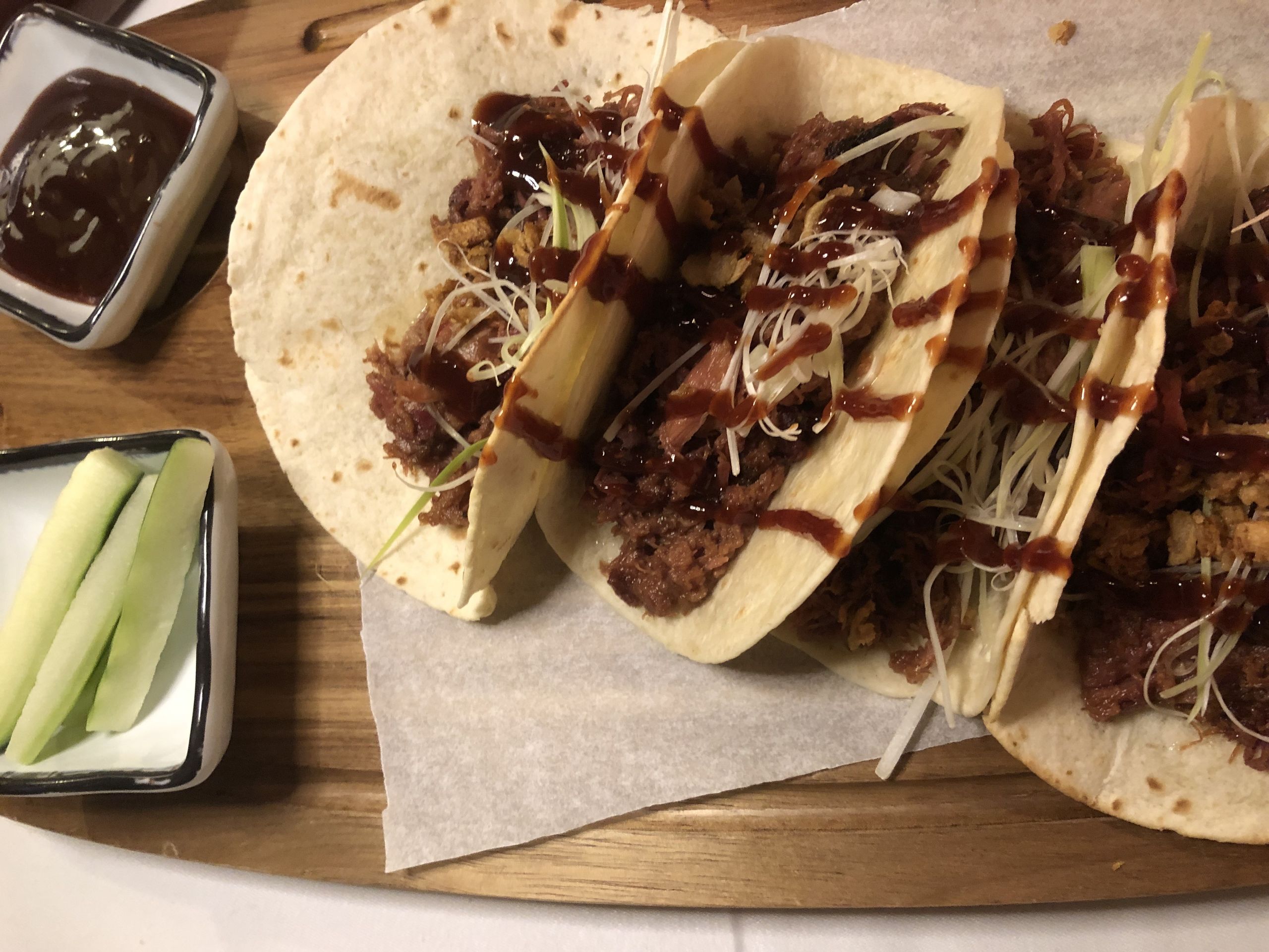 Taco de pato confitado a la naranja con tiras de puerro y salsa hoisin.