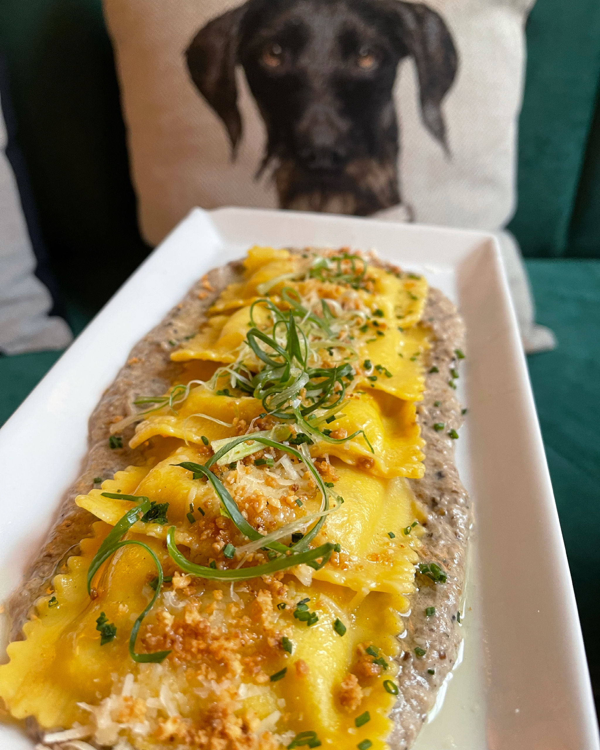 Ravioli de burrata con setas, salsa trufada y crujiente de galleta.