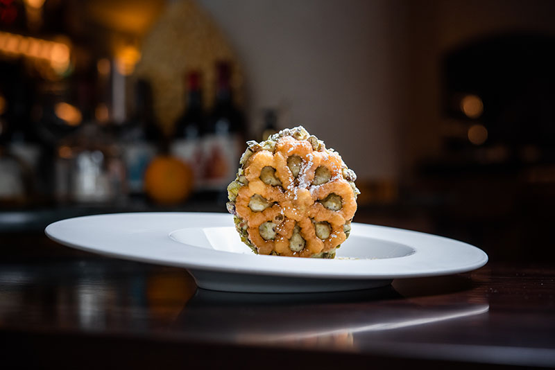 Arancina oziosa. Esta especie de croqueta está rellena de arroz, gambas rojas, burrata, limòn y menta sobre una salsa de stracchino y azafrán.