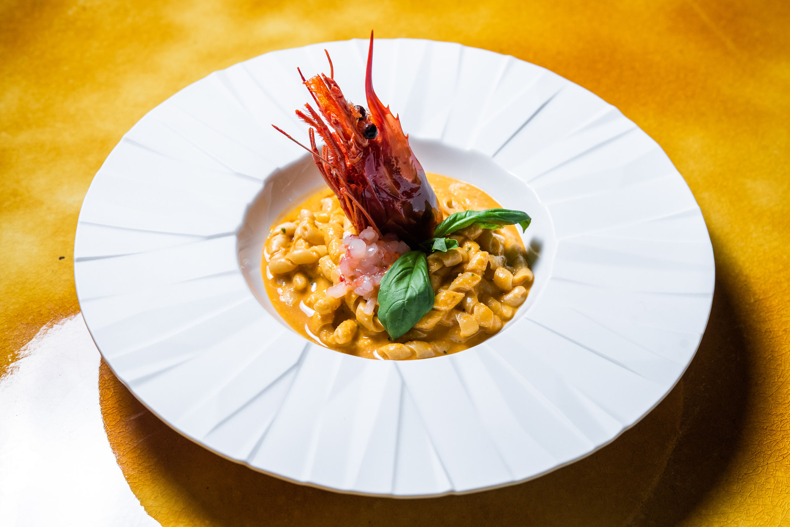 Busiato con pesto de Trapani y carabinero de Huelva. La pasta, con la versión siciliana del pesto hecho con almendras, tomates, ajo, sal y aceite de oliva y con el toque delicioso del tartar de carabinero.