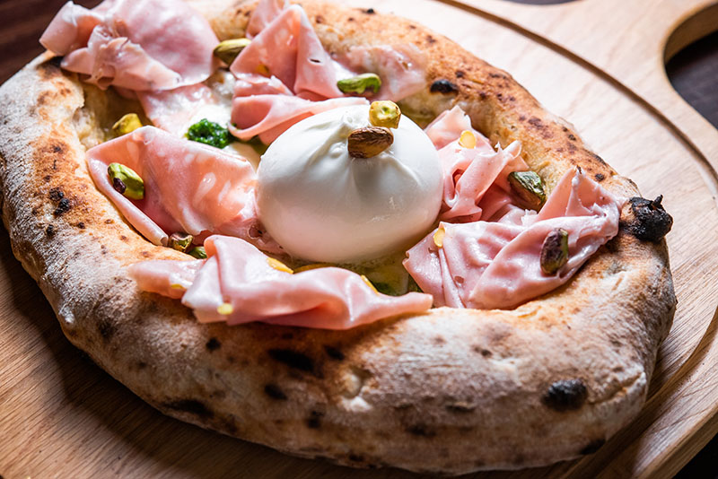 Covaccino Bronte, con burrata, mortadela Favola y pesto de pistacho de Bronte.