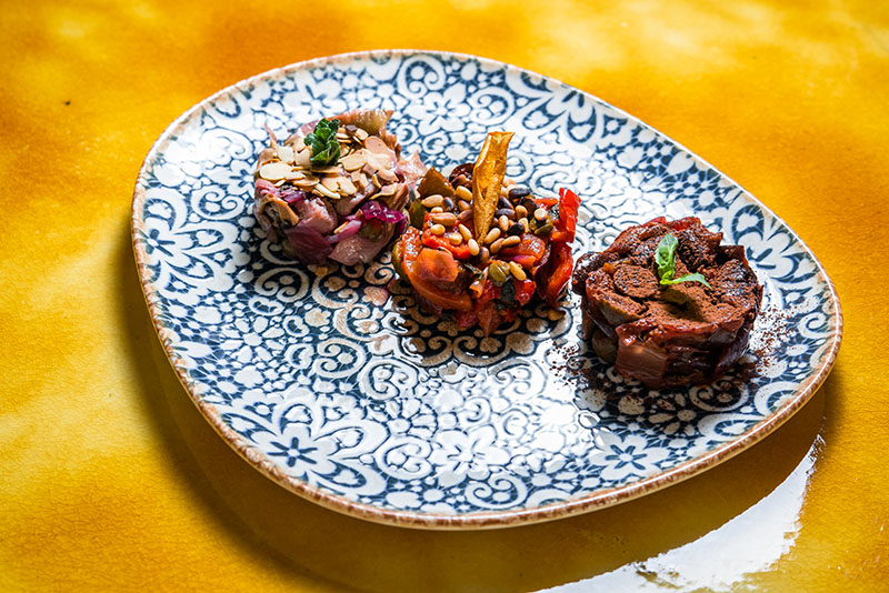 Las tres caponatas, una receta tradicional siciliana con sabor agridulce que se elabora con verduras y hortalizas y que presentan en tres porciones según la zona. En el centro de Sicilia el ingrediente principal es la alcachofa, en las zonas de Catania y Messina se añaden además pimientos y berenjenas.