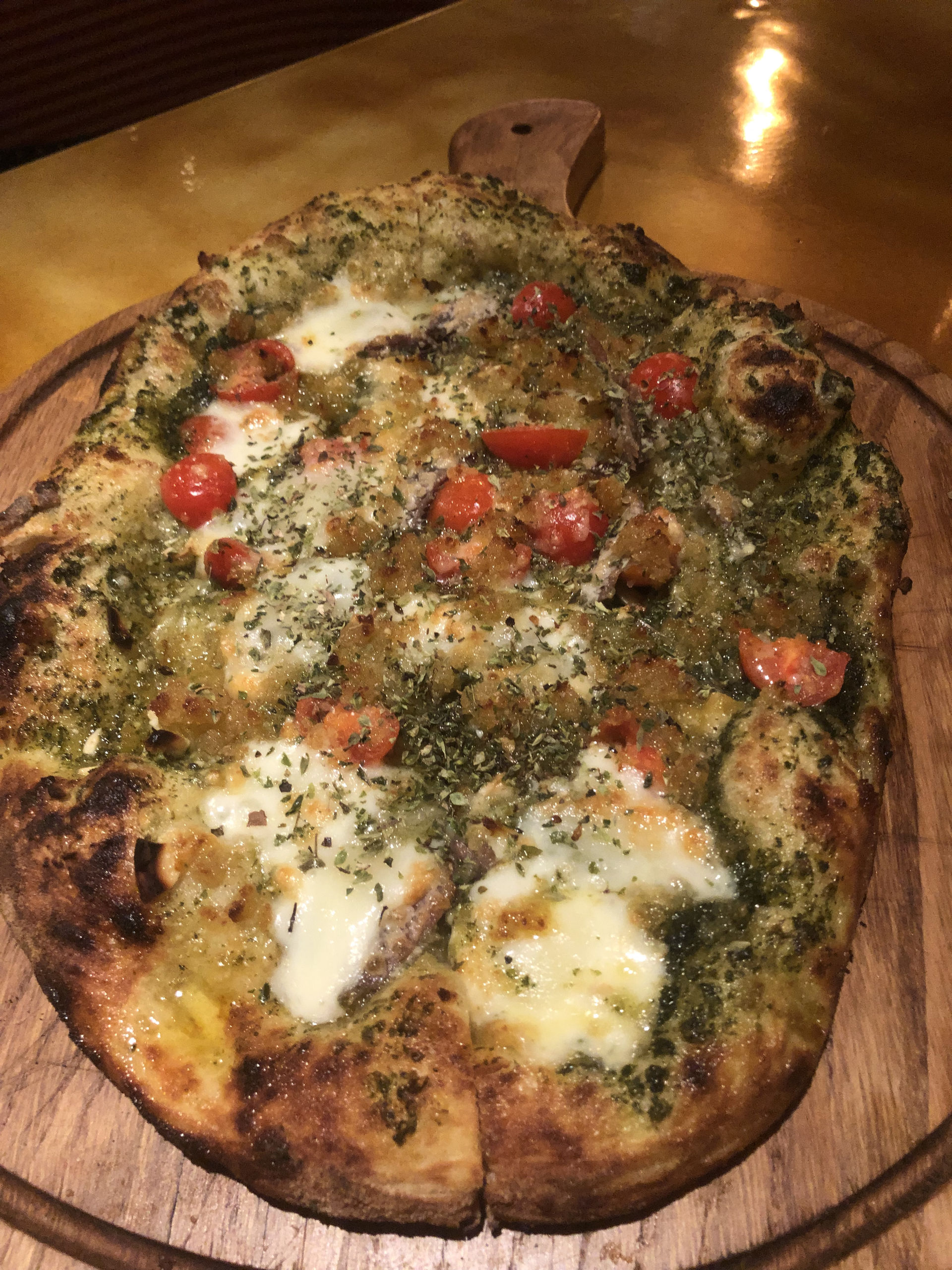 Pizza rianata, con pesto de perejil y almendras, anchoas del Cantábrico, tomates cherry pera de colores, quesos tuma y pecorino, aceite de ajo y orégano.