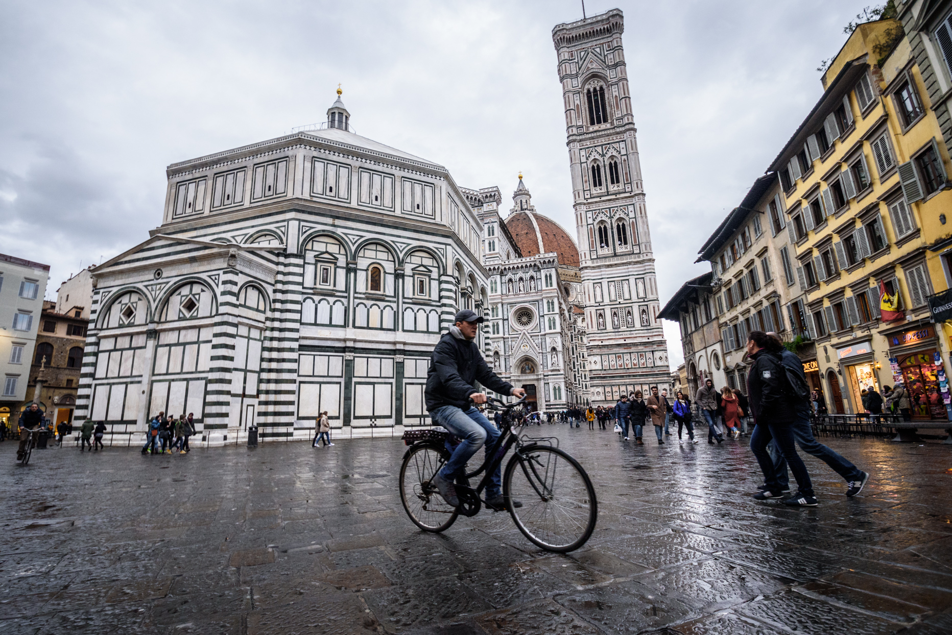 Un grupo de turistas pasean en bicicleta en la bellísima Plaza de San Giovanni de Florencia. El arte y la arquitectura de esta bellísima ciudad italiana pueden ser apreciadas también sobre dos ruedas.