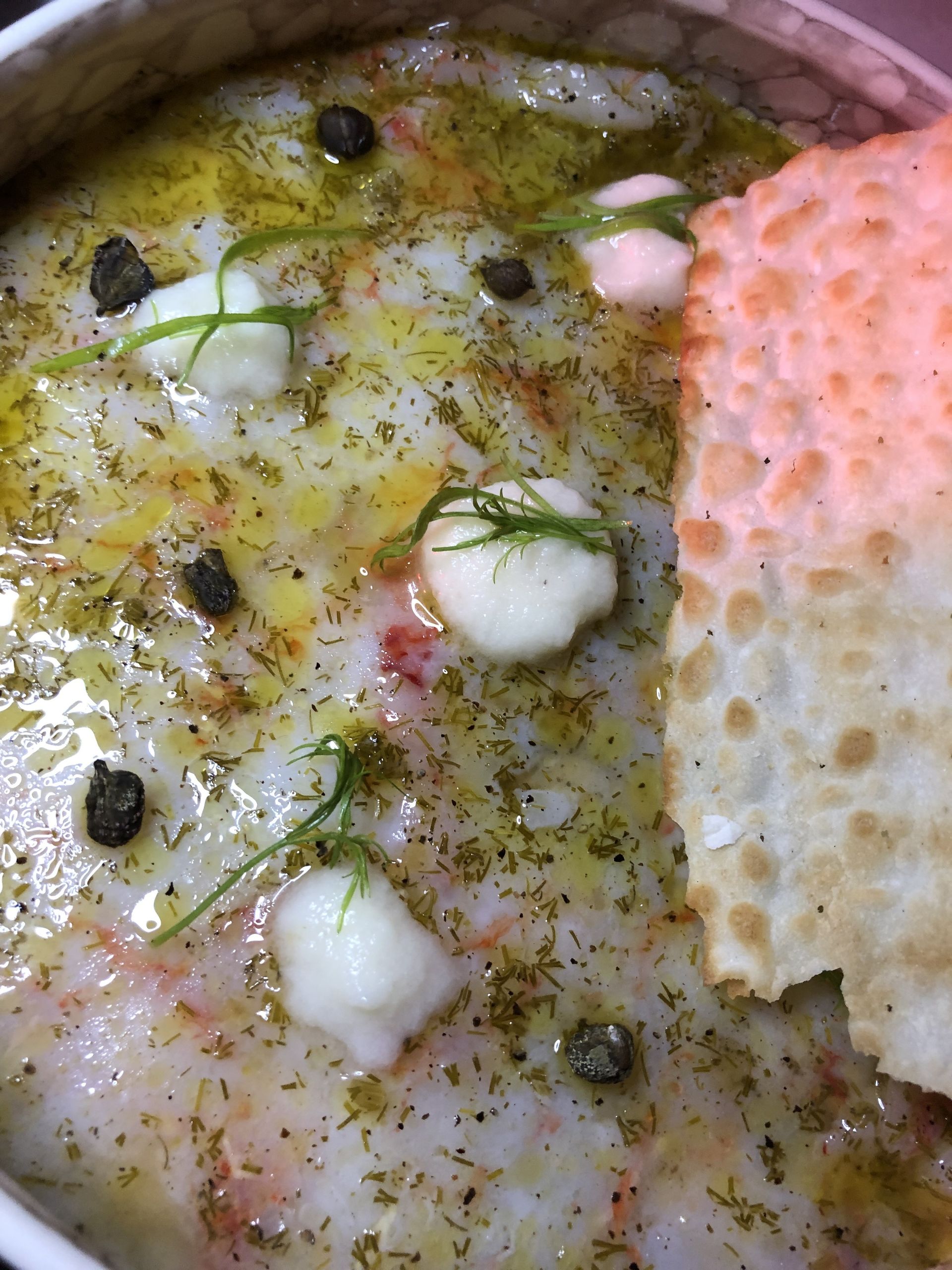 Carpaccio di gamberi rossi, con gamba roja de Denia, alcaparra deshidratada y vinagreta de eneldo.