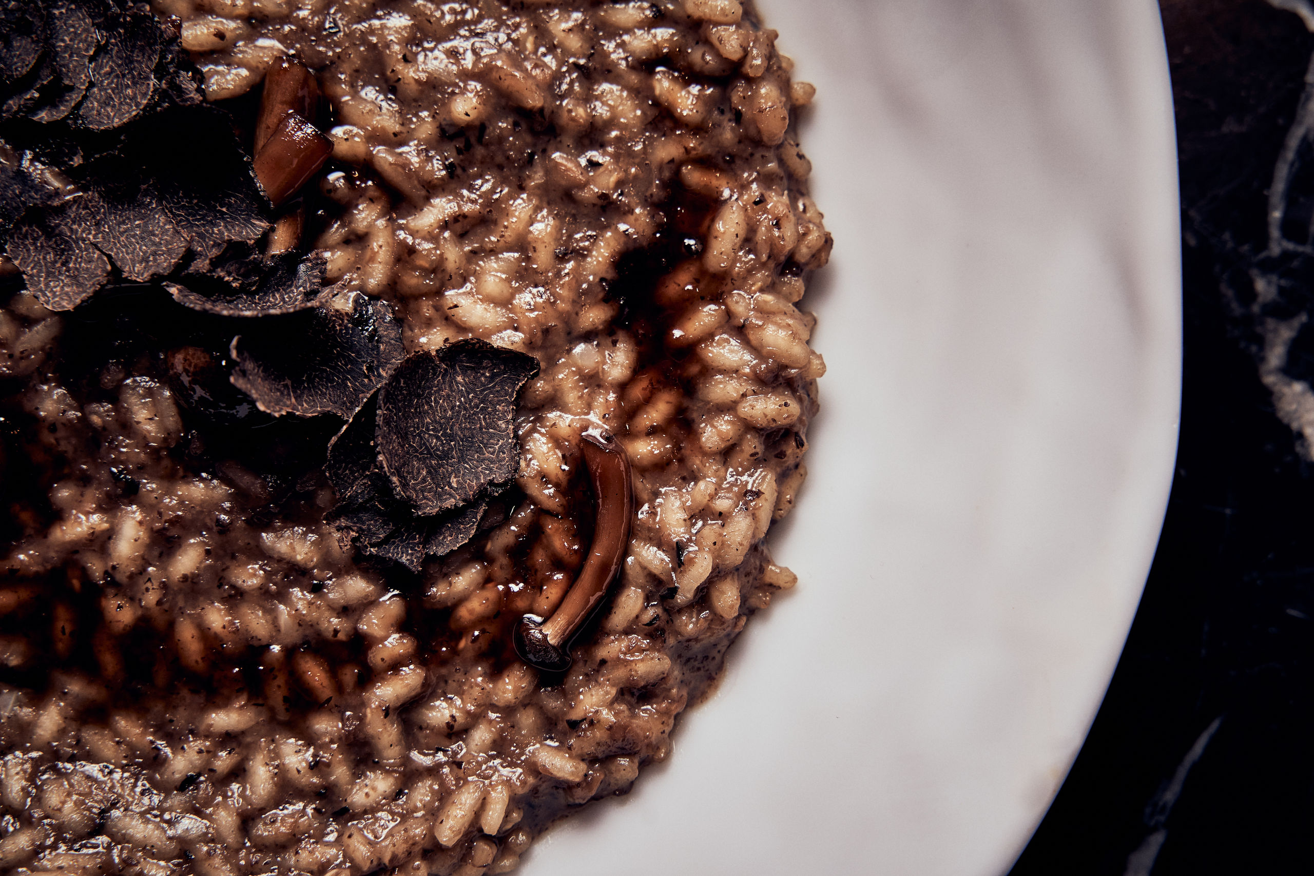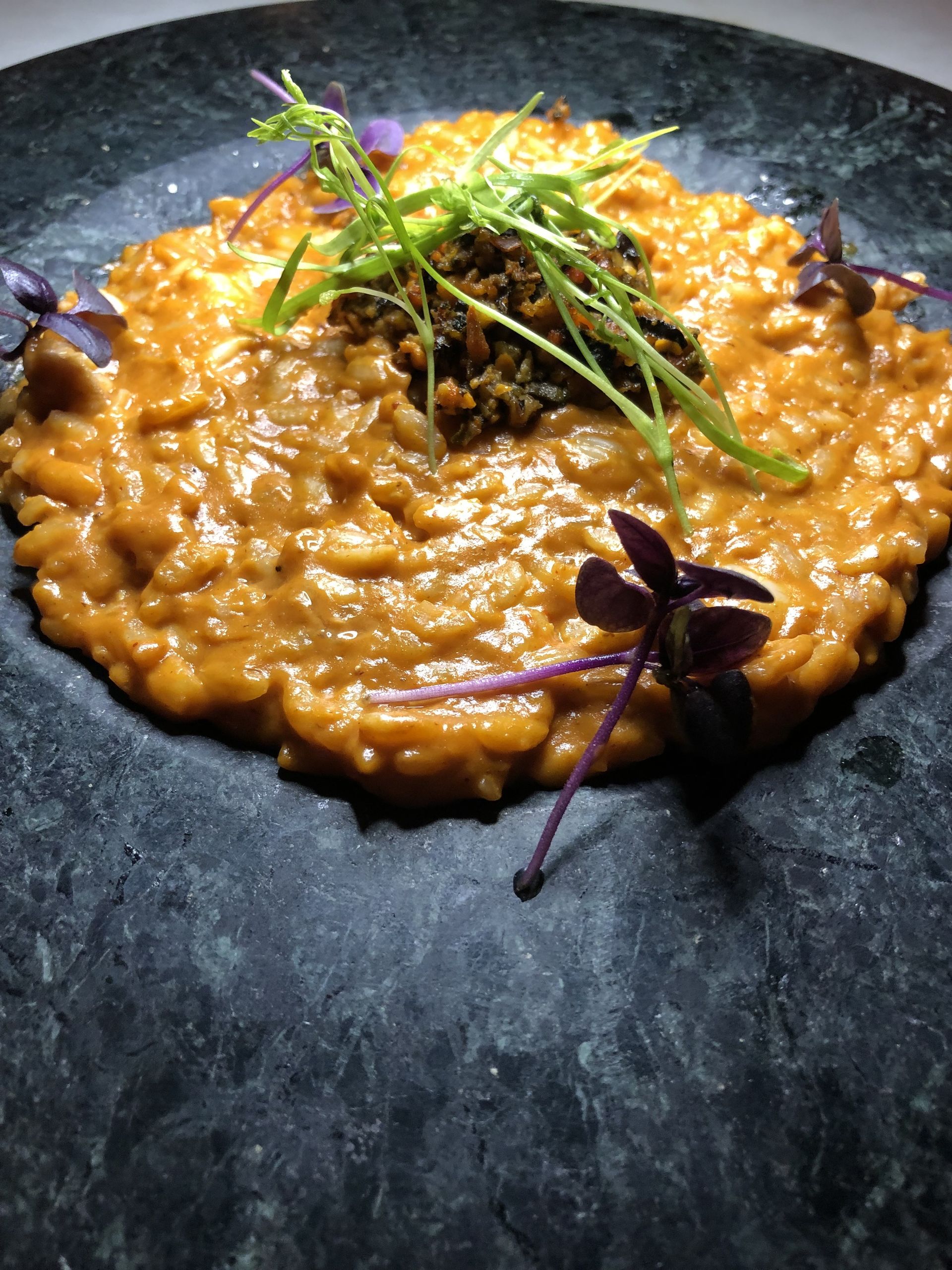 Risotto di gambieri, con bísque de gamba de Denia y tartar de mejillón.