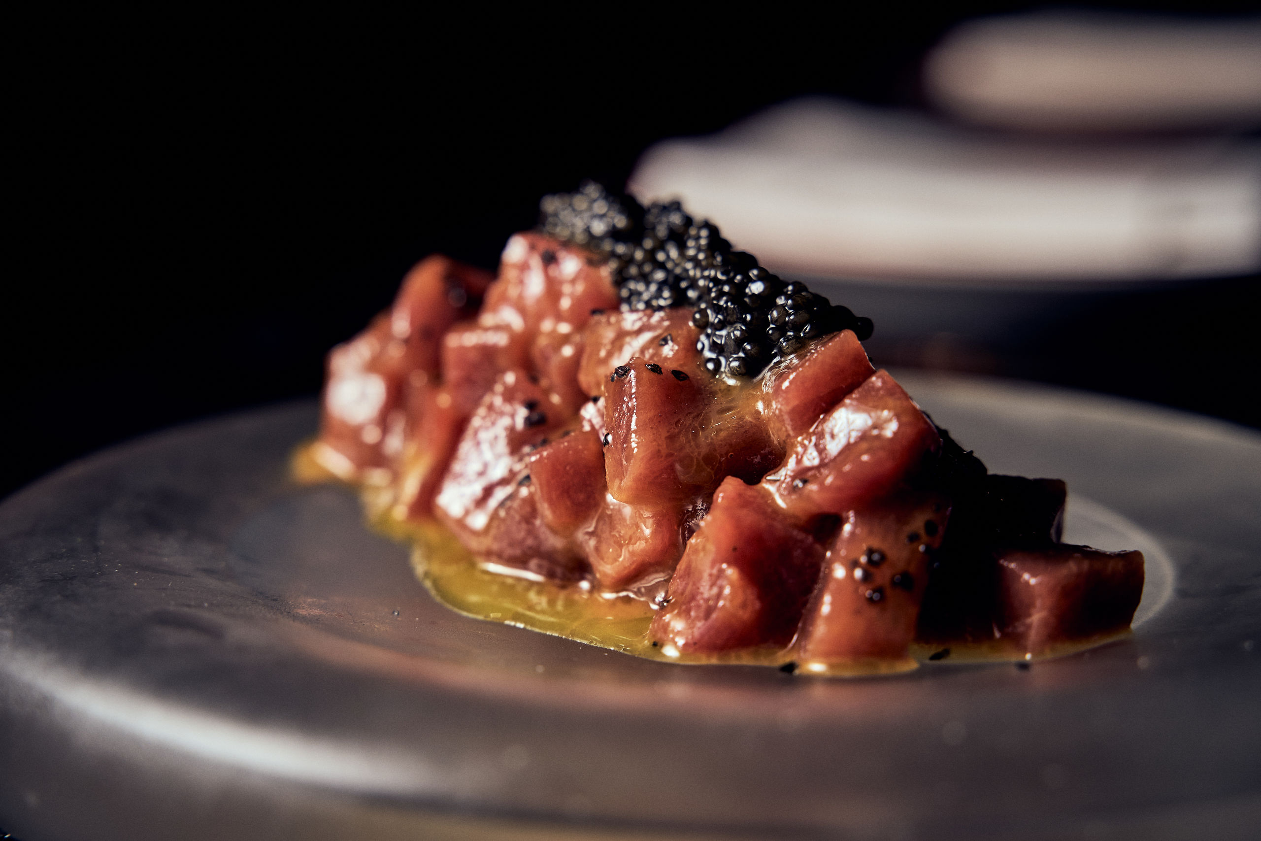 Tartare di tonni, atún aleta azul, tomate escarchado y yema de huevo curada en colatura de alicci.