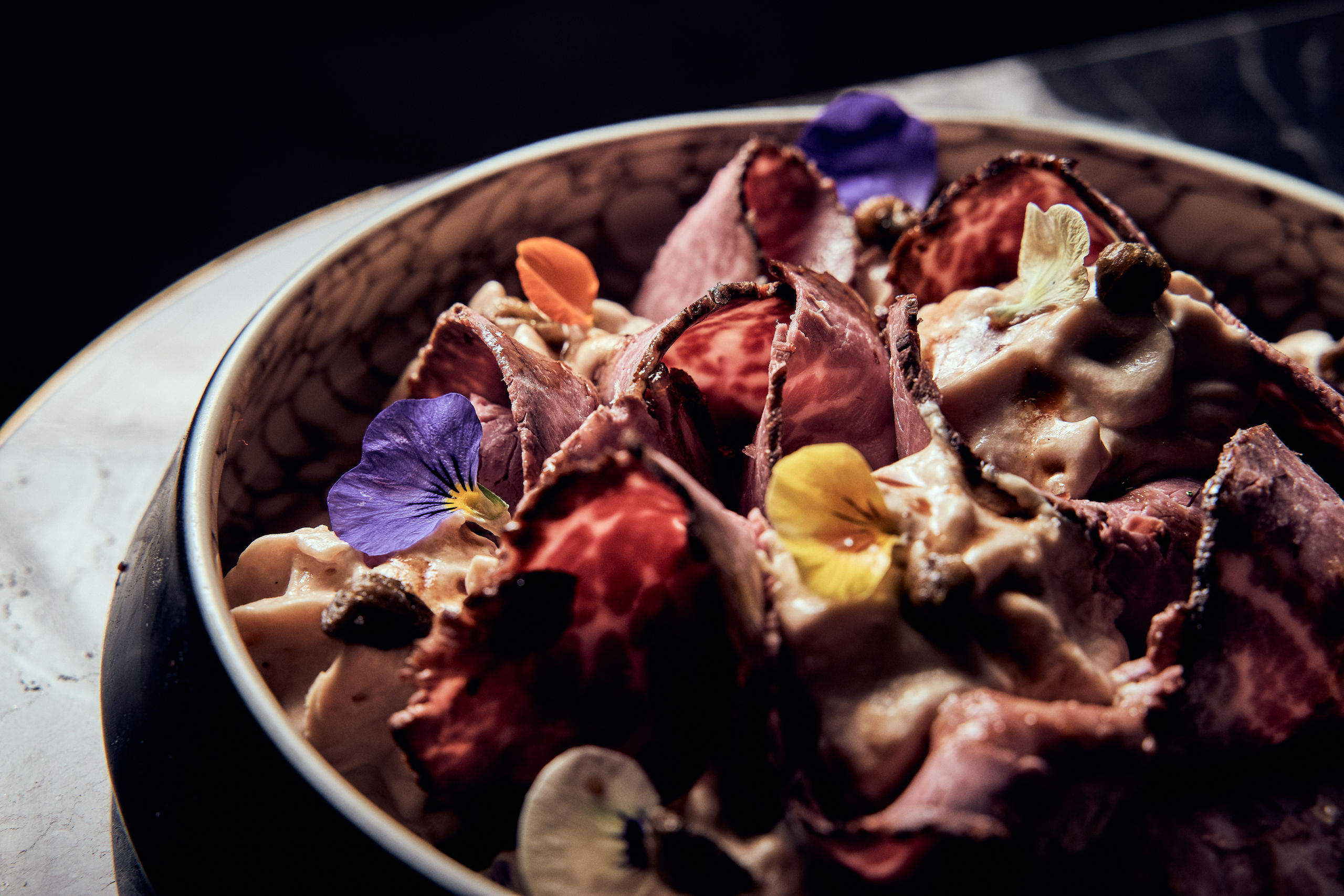 Vitello tonnato de solomillo de ternera cocida a baja temperatura, con espuma de ventresca de atún y demiglas de res.
