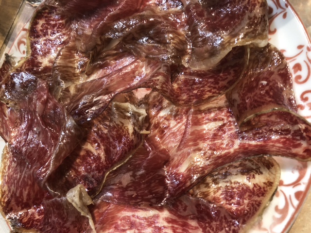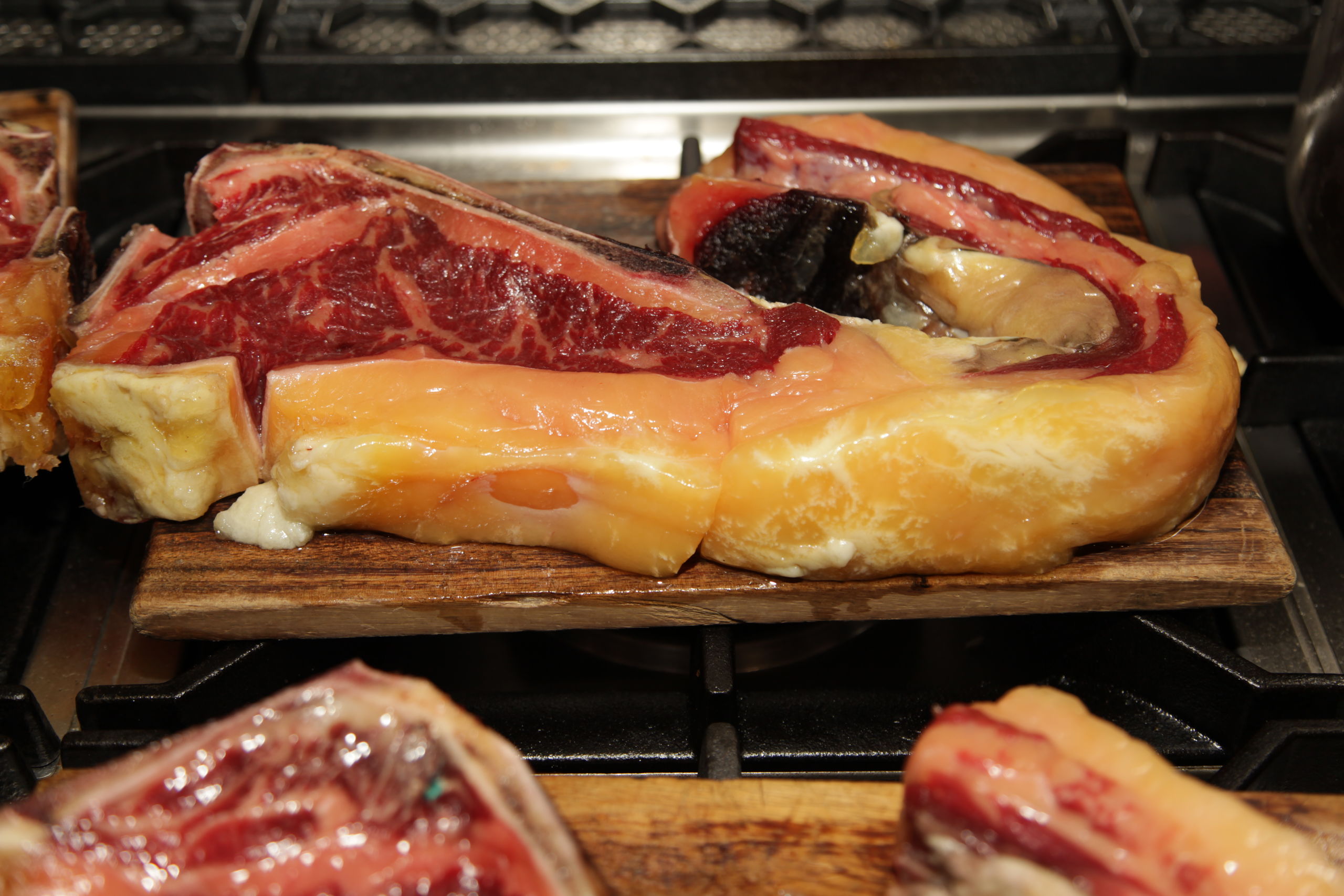Continuamos con el menú entorno al buey gallego, que lo podemos gozar gracias a los dos bueyes Texeiro y Fiz, adquiridos para Taberna Pedraza por el mayorista de carne de vacuna Discarlux en el concello de Vimianzo (La Coruña), de raza rubia gallega y que se alimentaron a base de pastos cercanos al mar, lo que le aportó a su grasa ese color "amarillo huevo" tan característico. Los bueyes terminaron de afinarse en los establos Fisterra Bovine World, la instalación rural próxima a Santiago de Compostela donde Discarlux efectúa la crianza de sus reses.