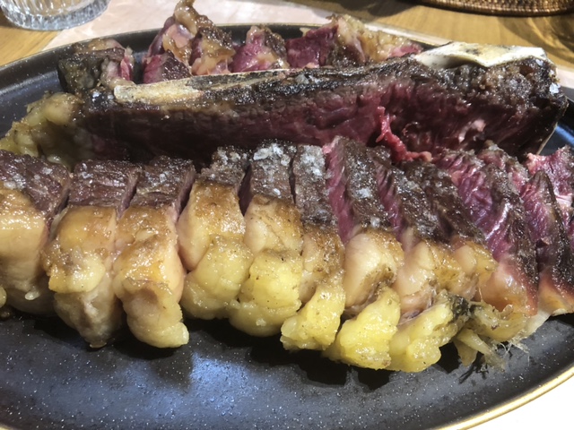 El lomo alto de buey gallego (139€/kg) que llega a la mesa se deshace en la boca, poco hecho, con un gran sabor a carne de larga crianza sometidos a maduraciones de hasta 140 días en cámaras secas y a la parrilla de carbón de encina que ejecuta con maestría Santiago Pedraza.