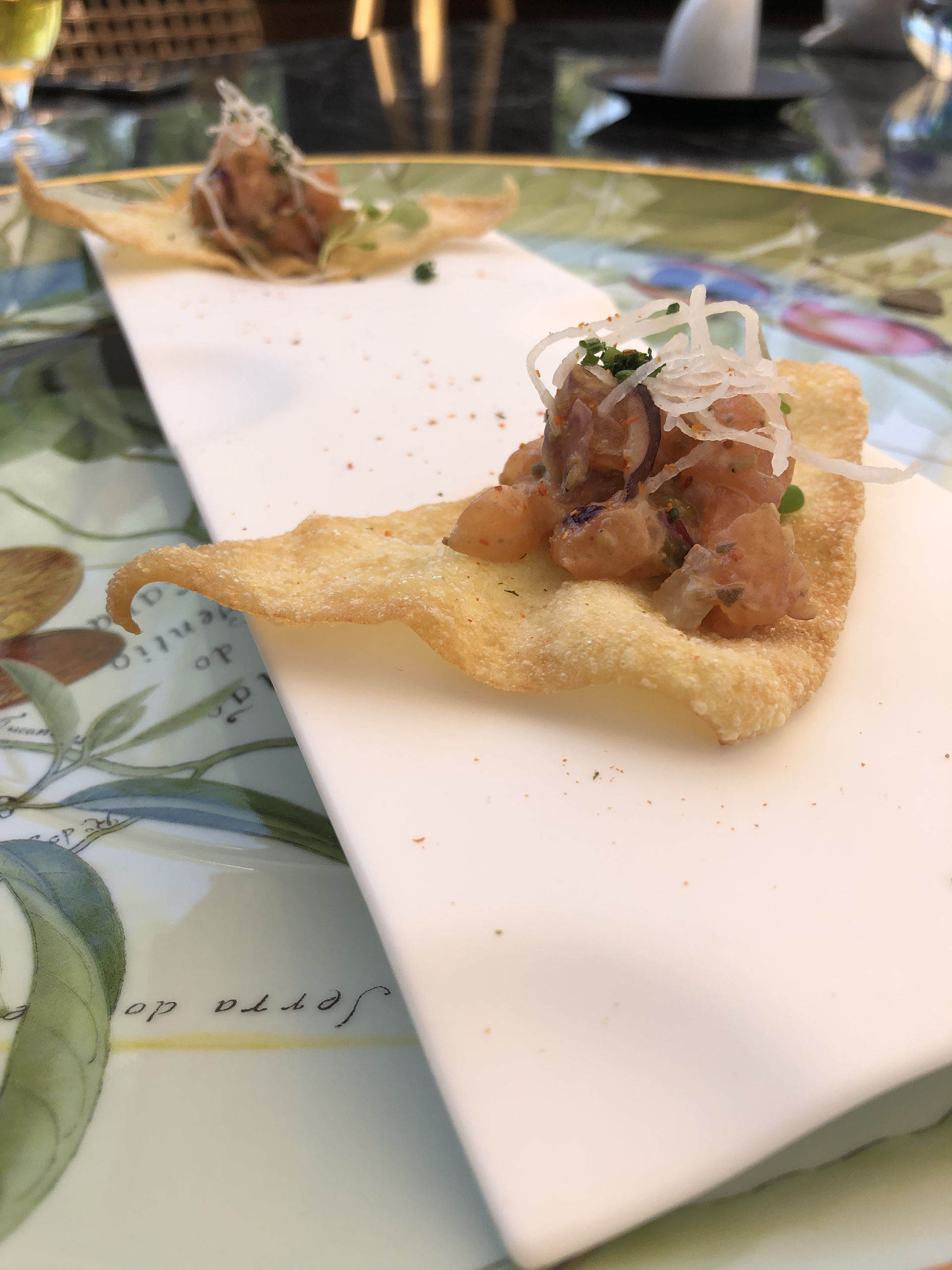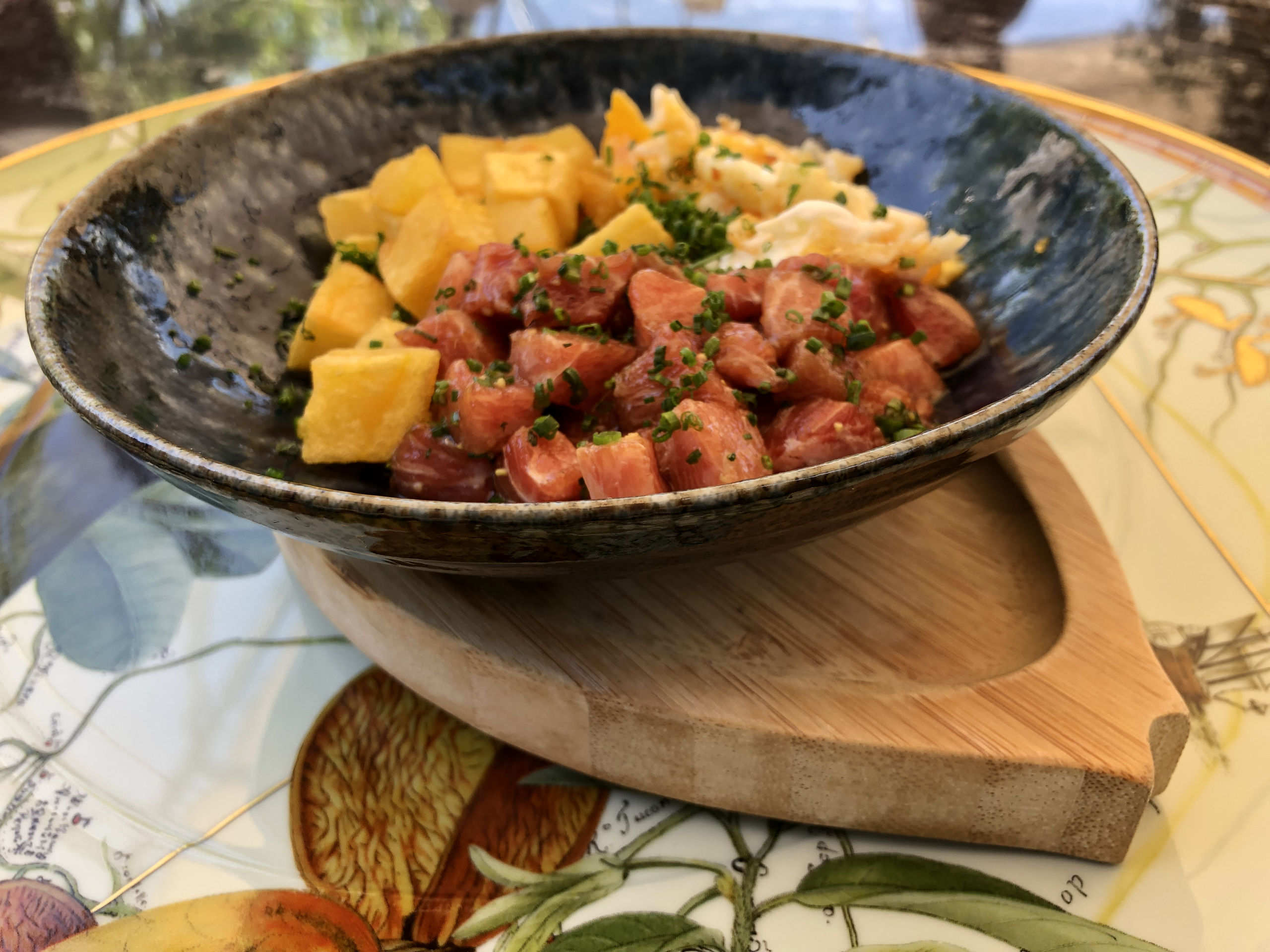 Tartar de ventresca de atún toro con huevo frito y papa canaria.