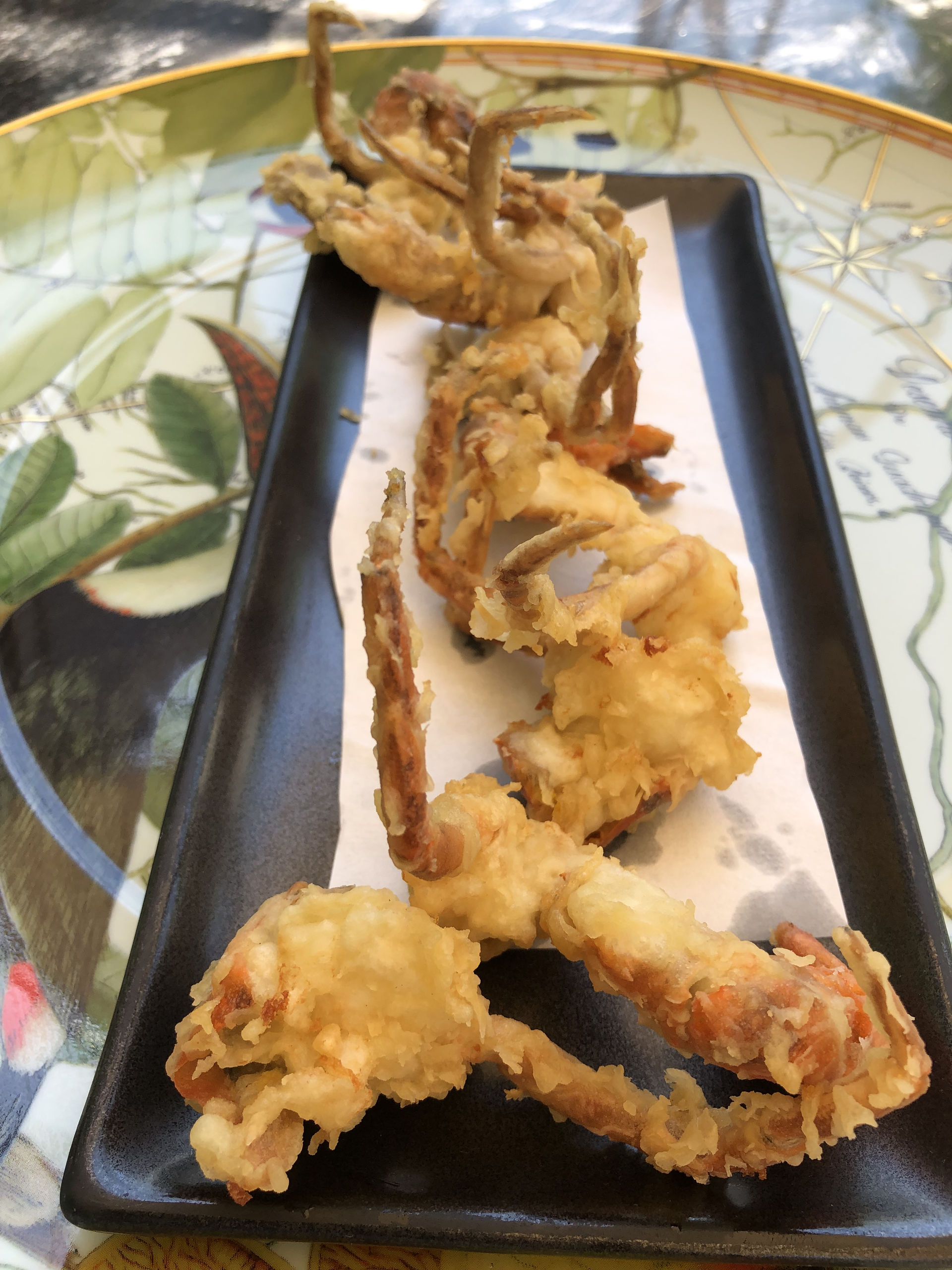 Cangrejo de concha blanda frito en almidón de patata, con salsa tentsuyu, yema de corral y trufa.
