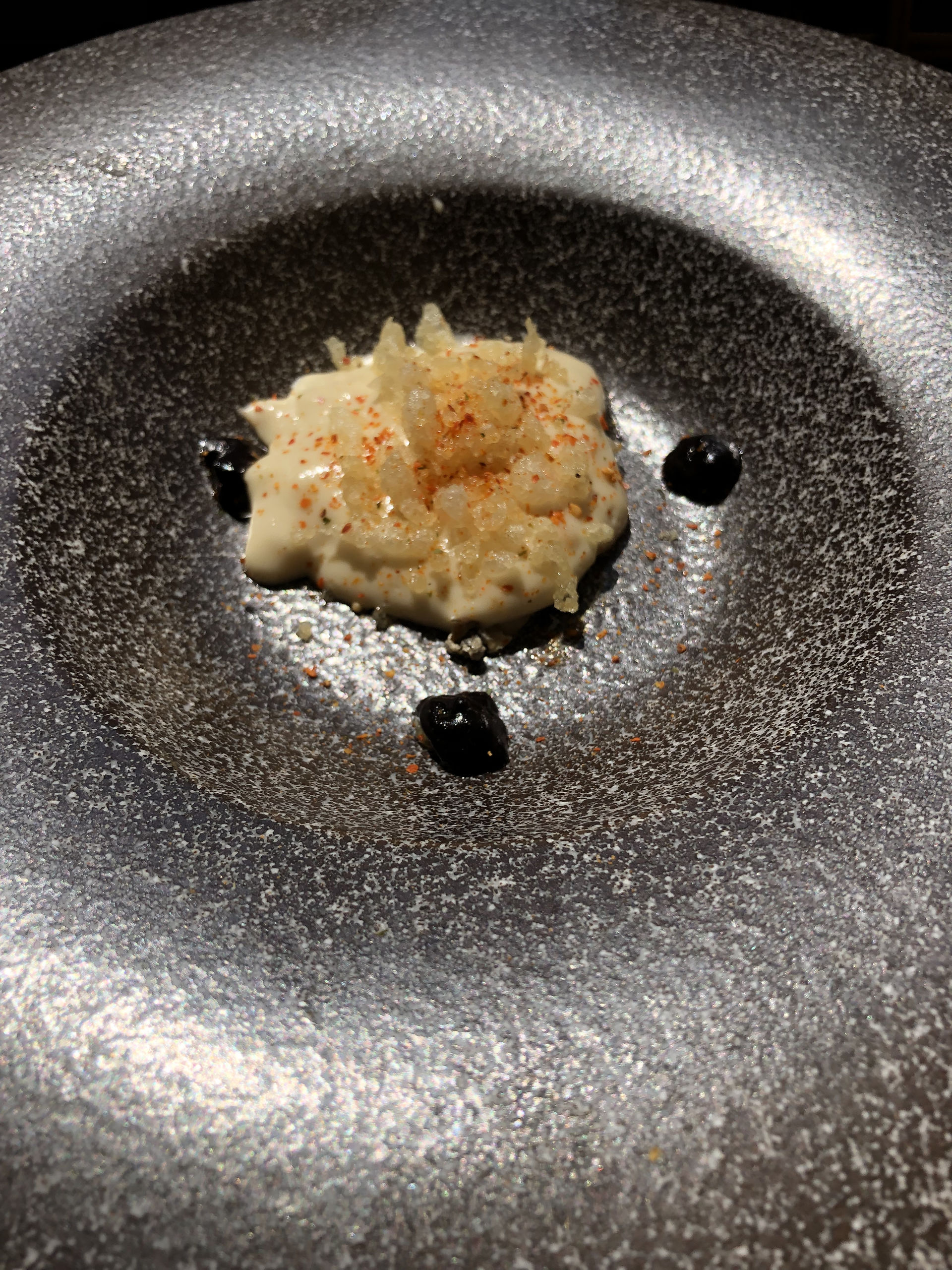 Cococha de merluza al pilpil ahumado de miso, emulsión de ajo negro japonés y chips de ajo.