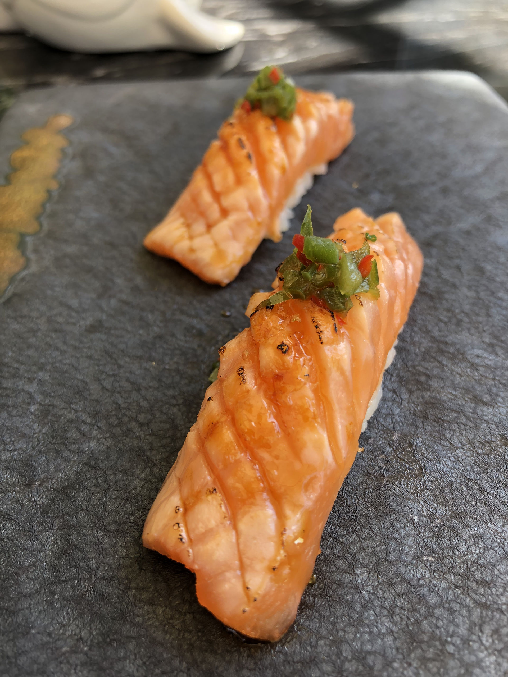 Gunkan de toro ligeramente picante con tobiko y harina frita con tobiko.