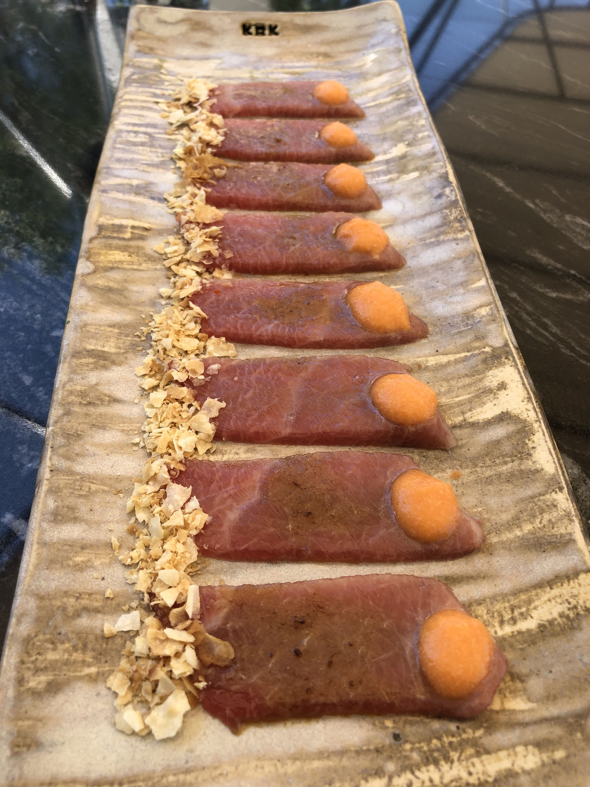 Usuzukuri de toro andaluz, con salmorejo, aceite oliva virgen extra, Tamari y pan carasatu.