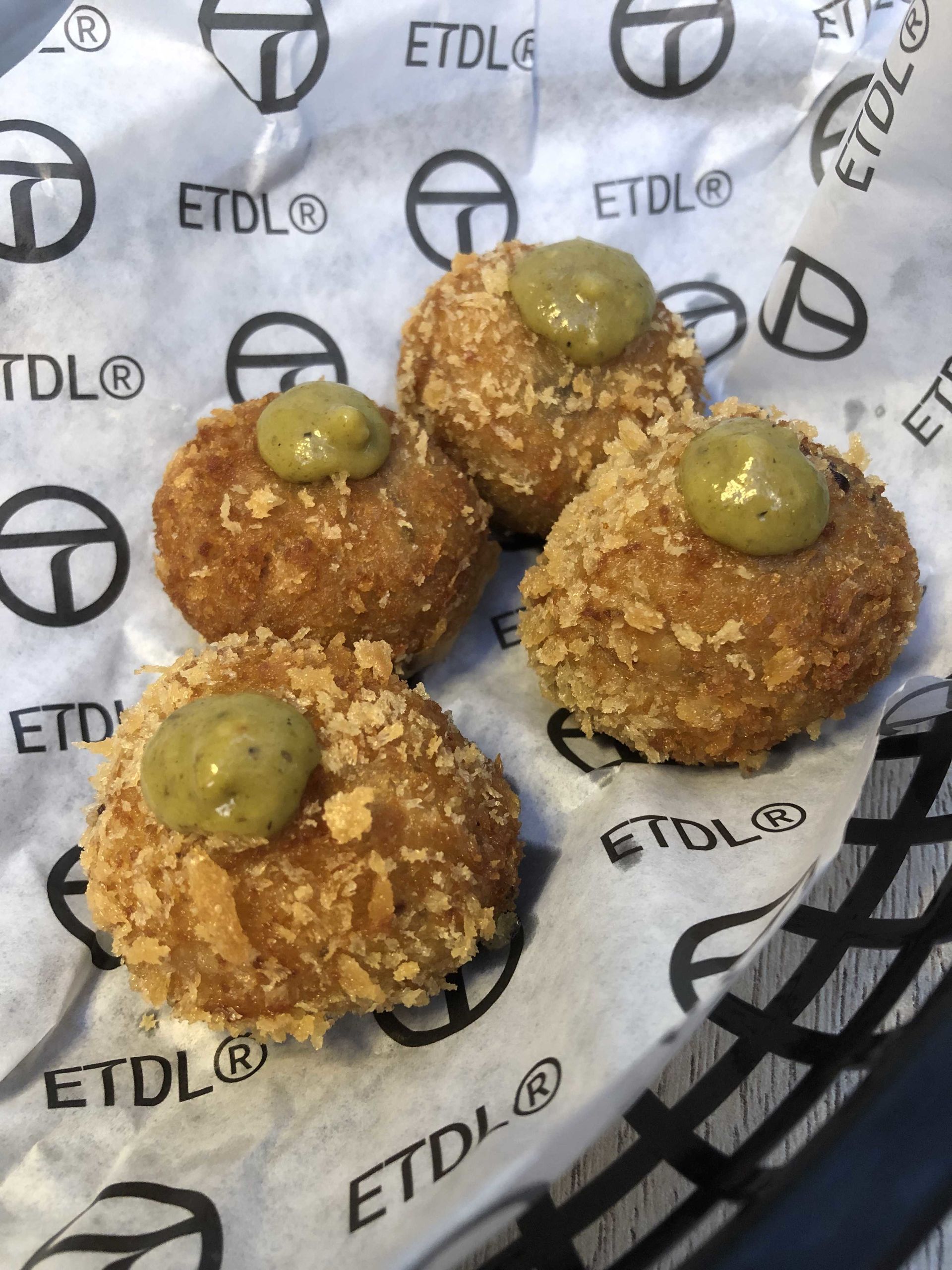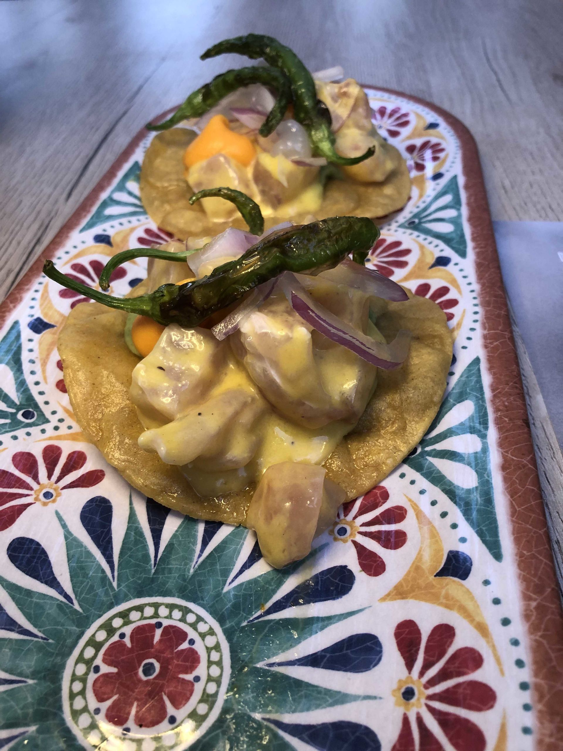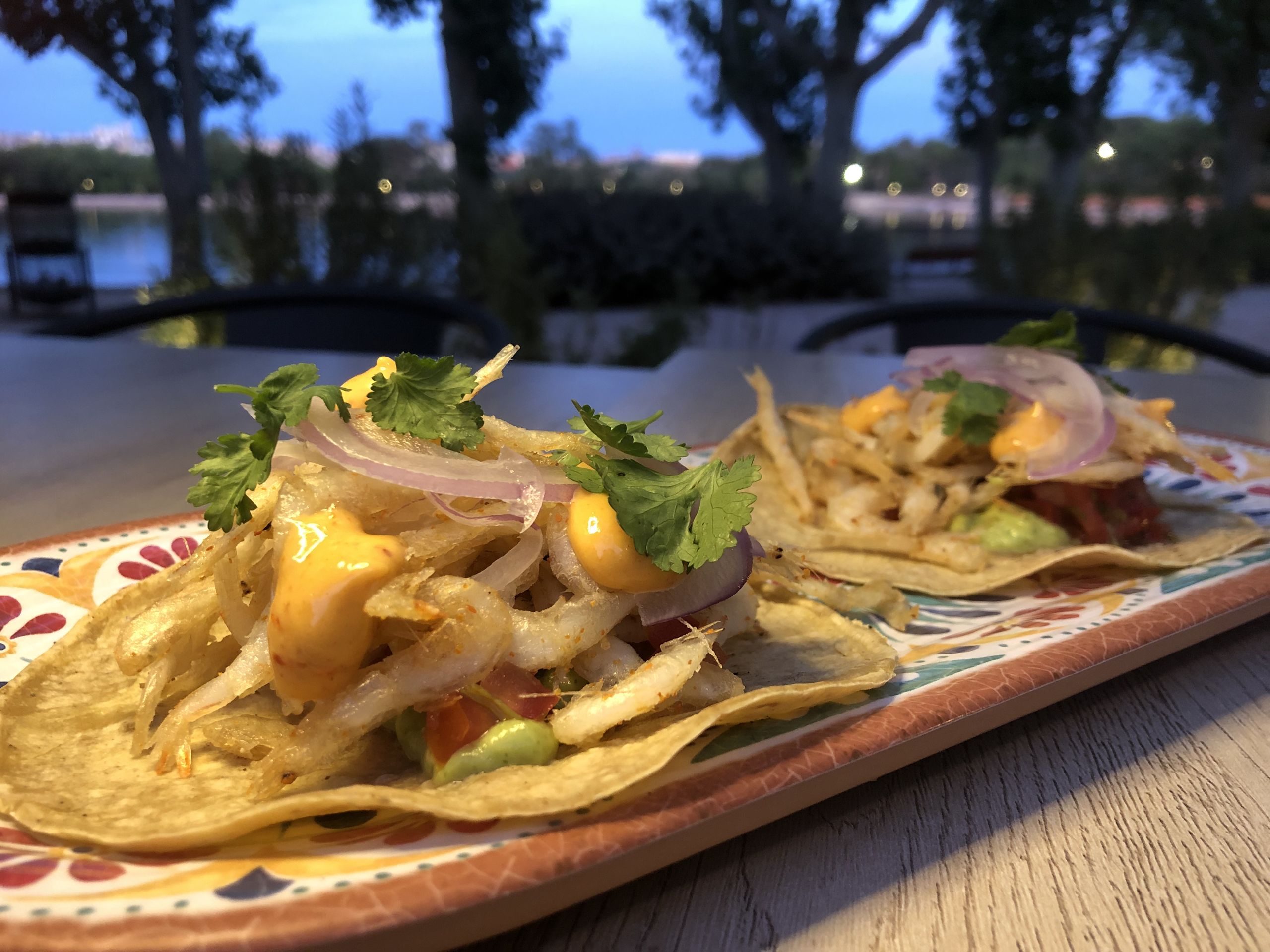 Taco del gobernador con gamba de cristal, aguacate asado y mayonesa de chipotle.