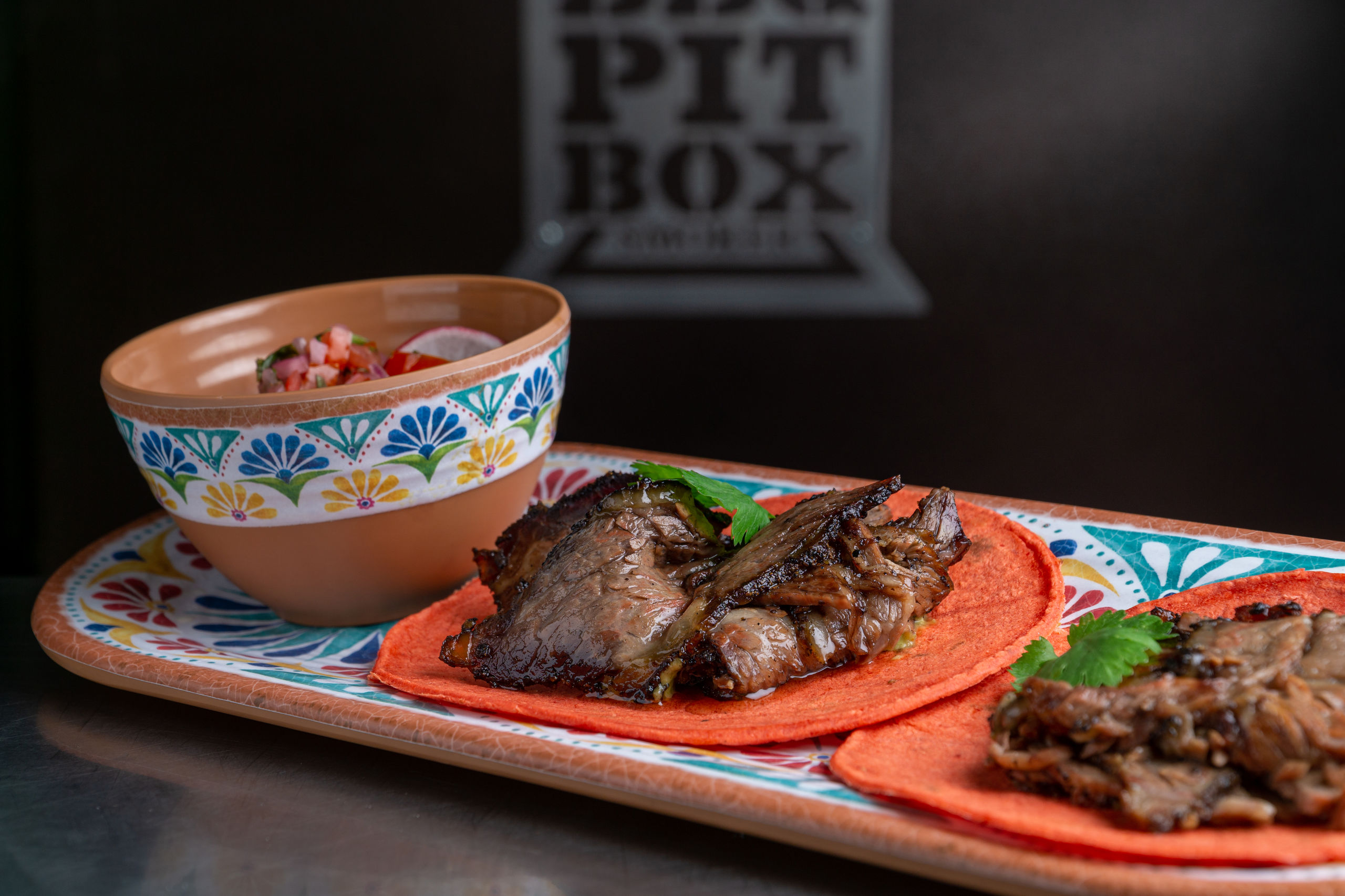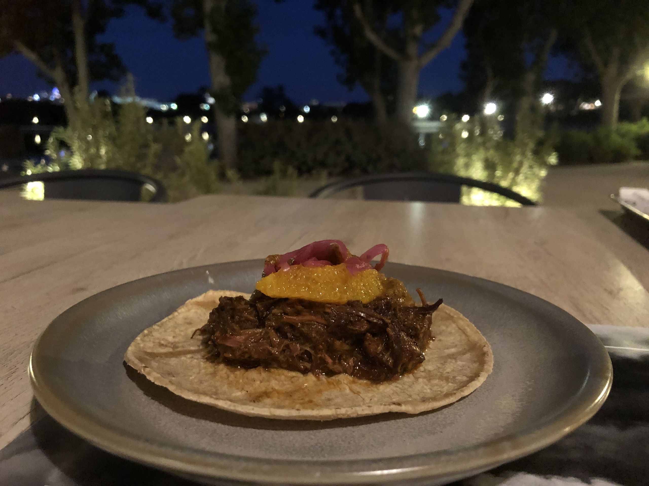 Taco de cochinita pibil, de aguja de cerdo ibérico, cebolla roja, guacamole y cilantro.