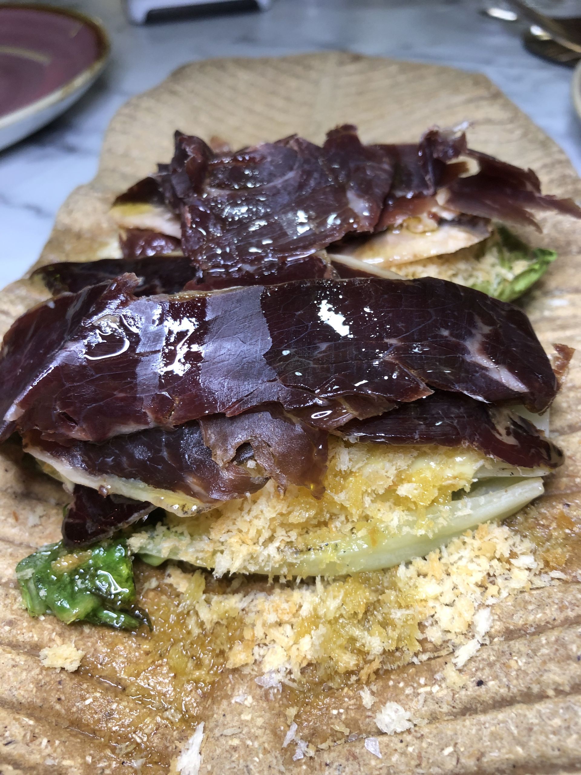 Cogollos a la brasa, salsa césar, cecina de picaña y pecorino de Cerdeña.