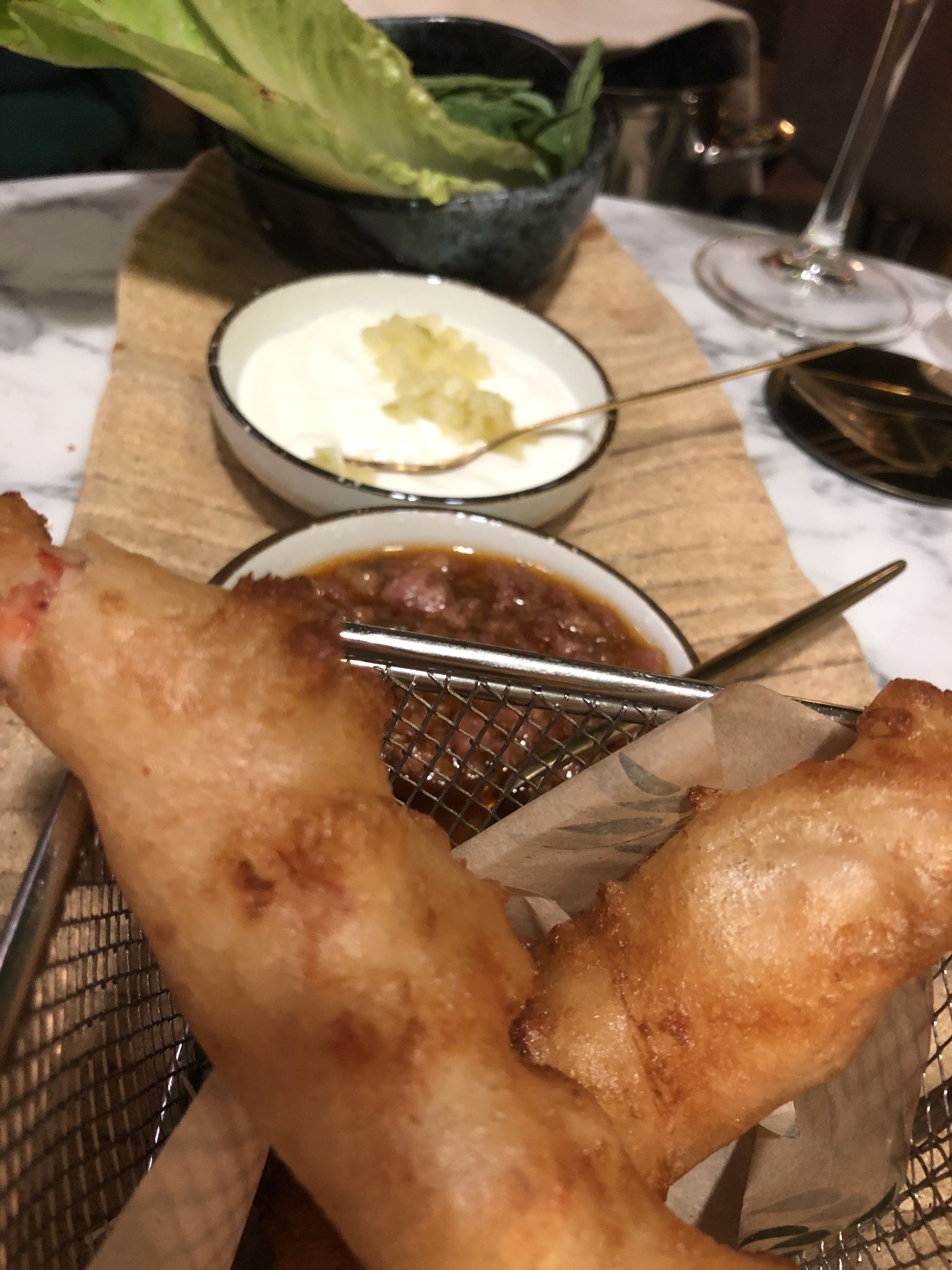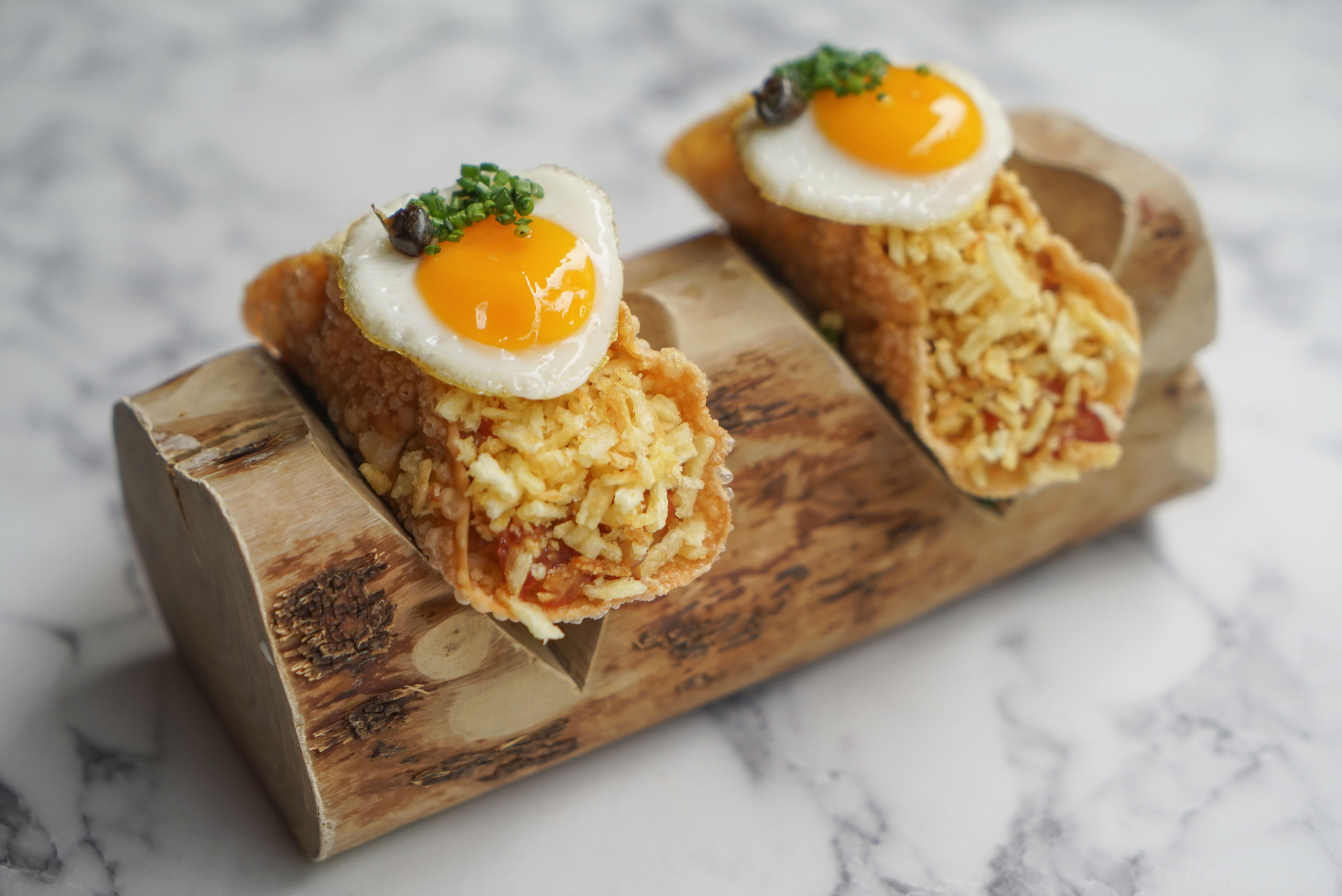 Taquitos de steak tartar de solomillo de ternera de morucha, huevo de codorniz y patatas fritas.