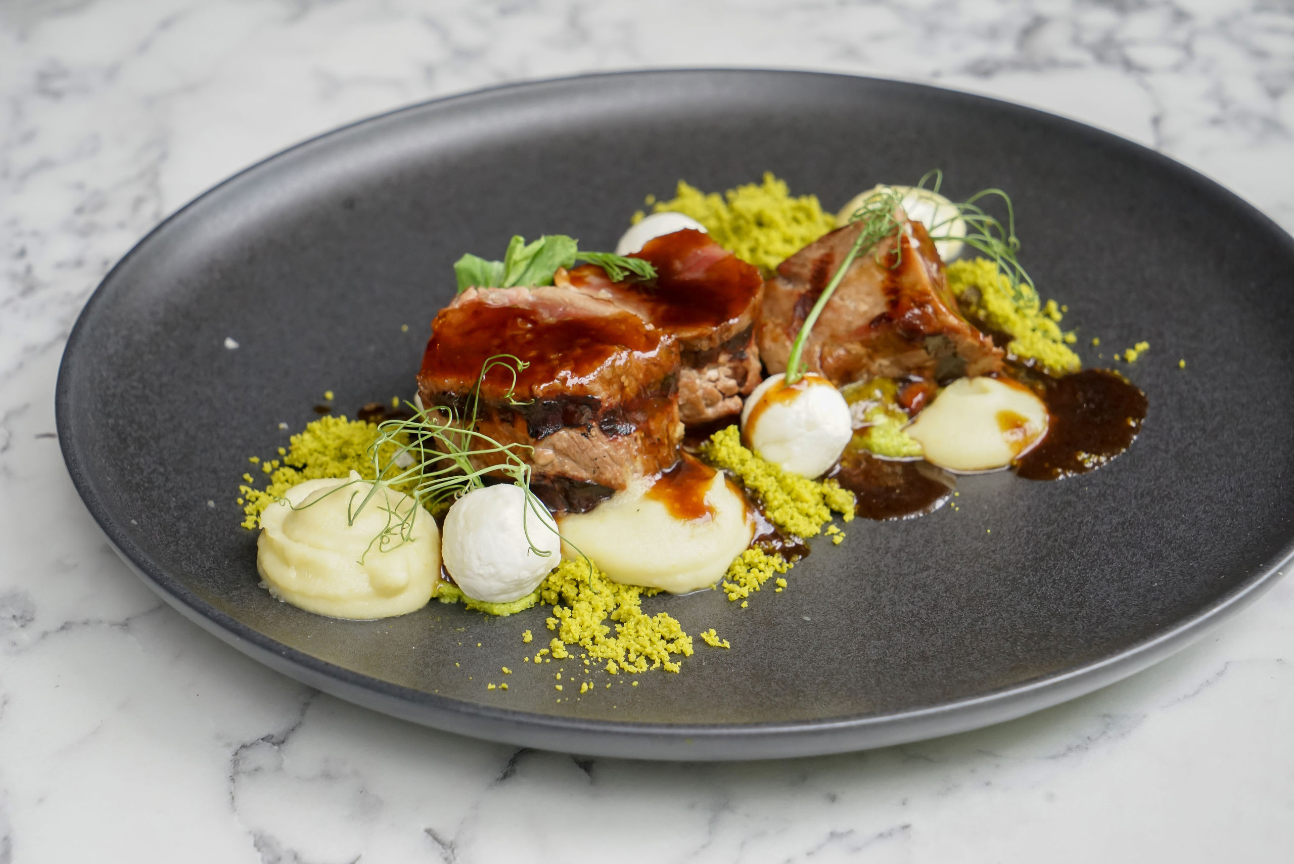 Solomillo de cerdo ibérico de bellota, praliné de pistachos, queso de cabra y manzana verde.