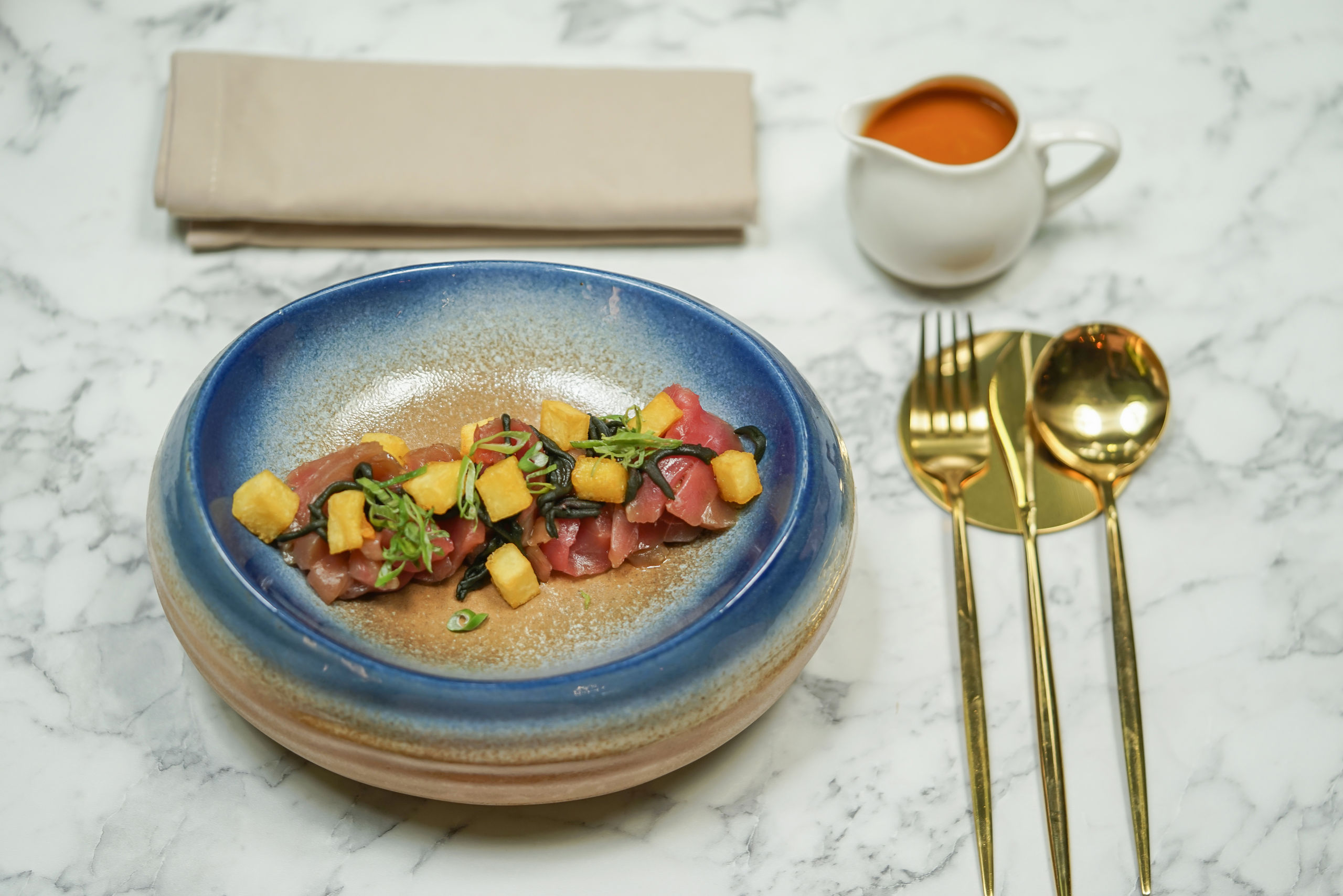 Tartar de atún rojo, huevo frito, patatas fritas y trufa de verano.