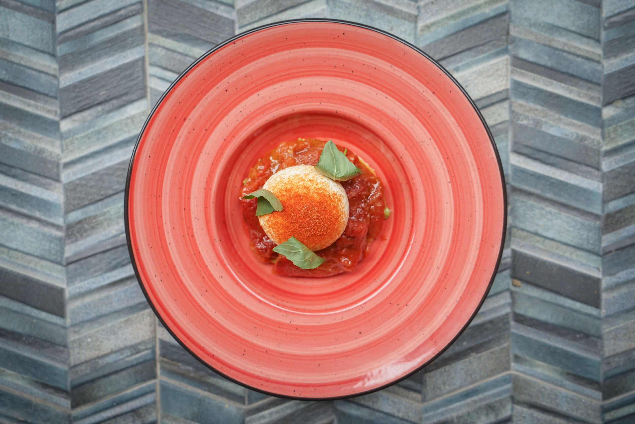 Burratina con tatín de tomate, vinagre balsámico, yuzu y pesto.