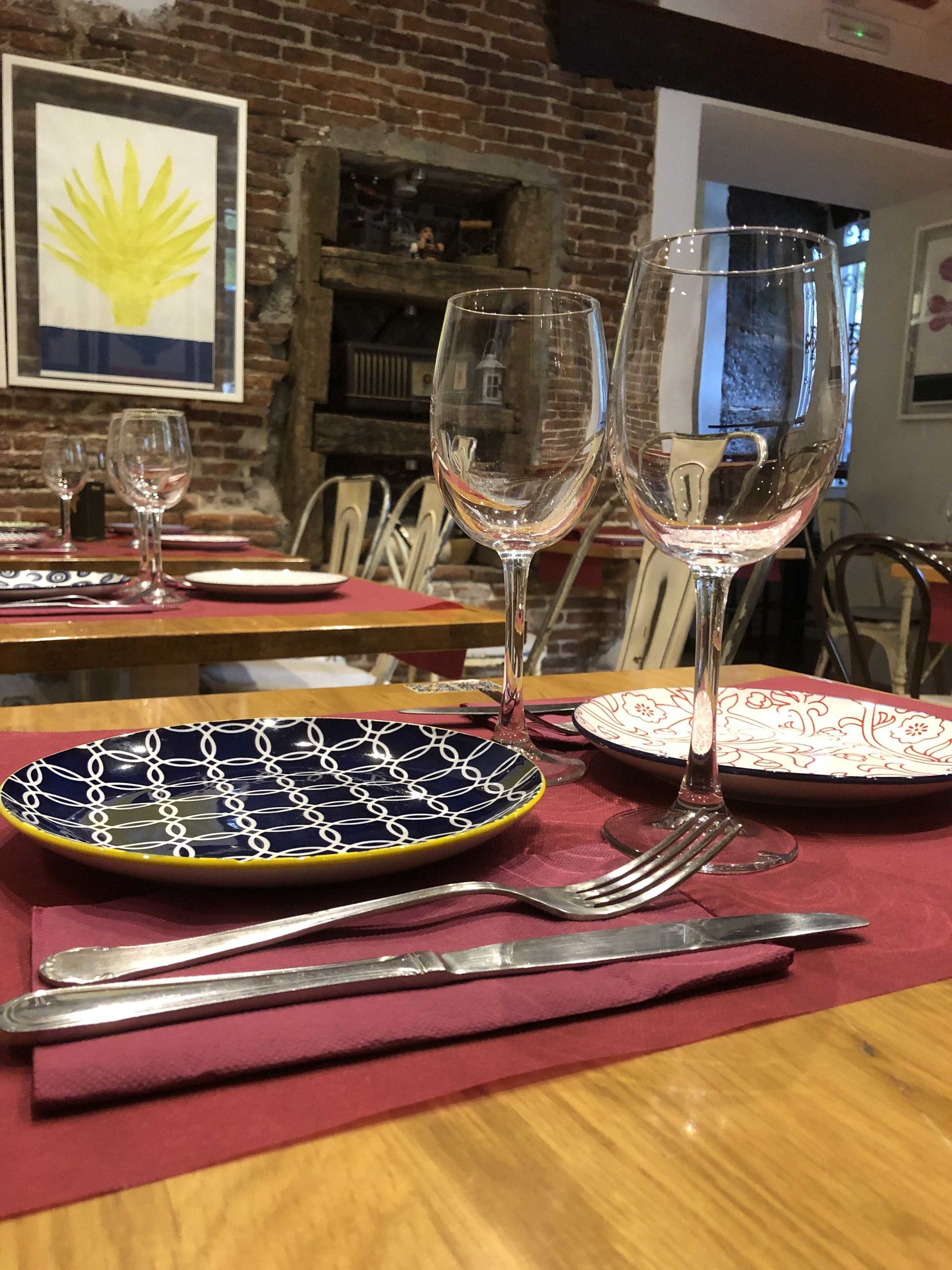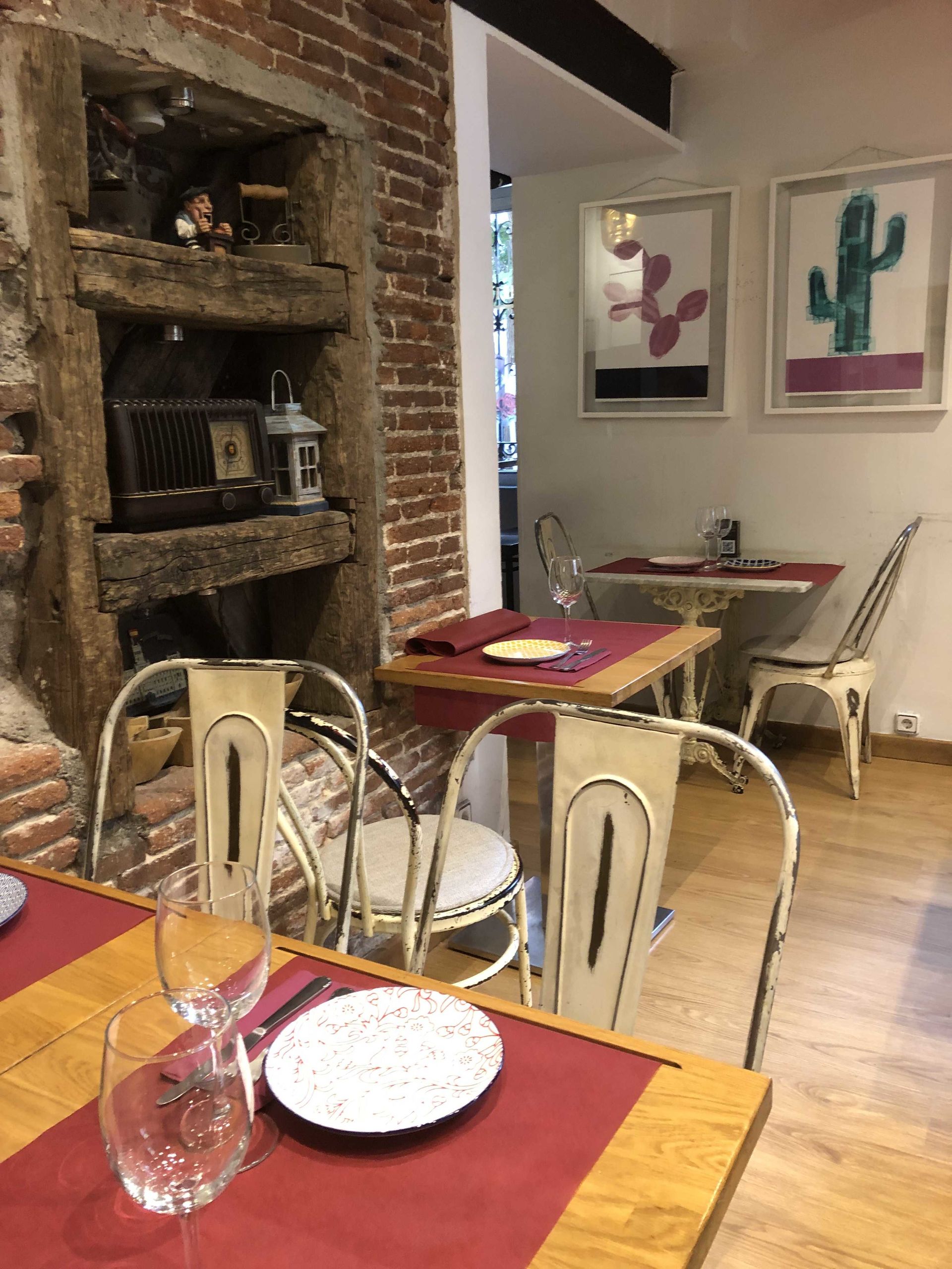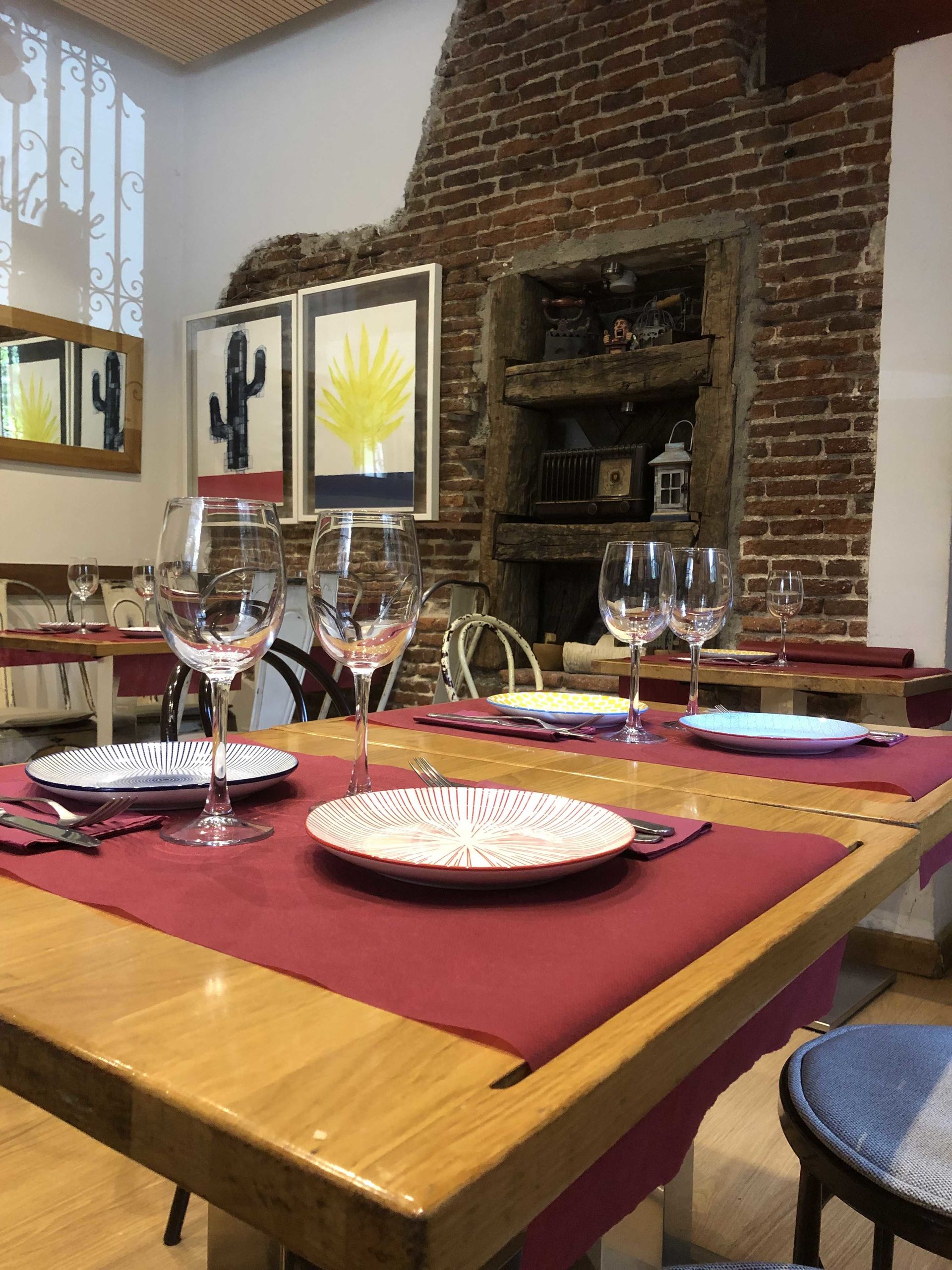 Detalles del comedor del restaurante Adrede con e ladrillo visto.