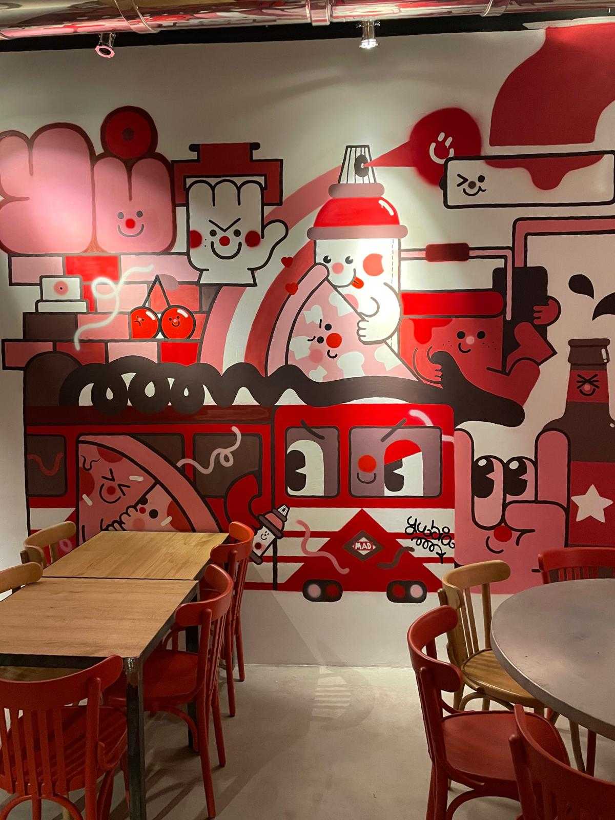 Can Pizza se caracteriza por tener un estilo moderno y atrevido, apoyándose en el trabajo mano a mano de artistas como Ramón de los Heros y el estudio de diseño Lo Siento. Además, apuestan por el trabajo de artistas urbanos para que personalicen a su gusto una pared en cada uno de sus locales. En esta ocasión, para el local ubicado en el número 85 de la calle Serrano de Madrid, ha sido la joven graffitera Yubia la encargada de plasmar su arte otorgándole una personalidad única a esta nueva sede.
