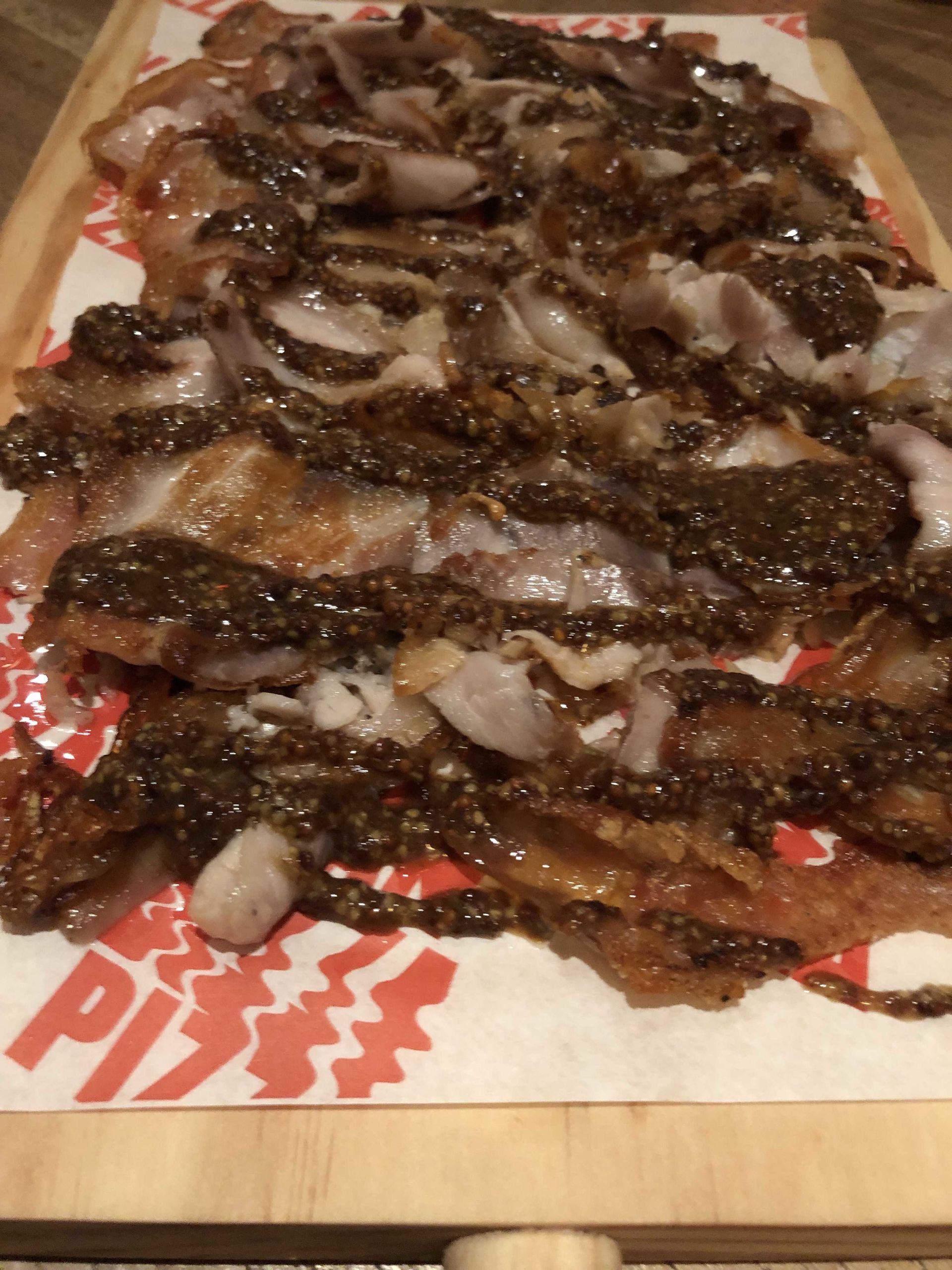 Can Pizza ofrece platos "para empezar" como algunas ensaladas o carpaccios, y "platos calientes" para ir abriendo el apetito como lasaña o los chicken fingers. Pero aconsejados por el amable personal del restaurante probamos la porchetta (11,50€), con salsa de mostaza y miel. Es un carpaccio de carne de cerdo que ha sido deshuesada y asada al horno. Un plato muy bueno para ir abriendo el apetito.