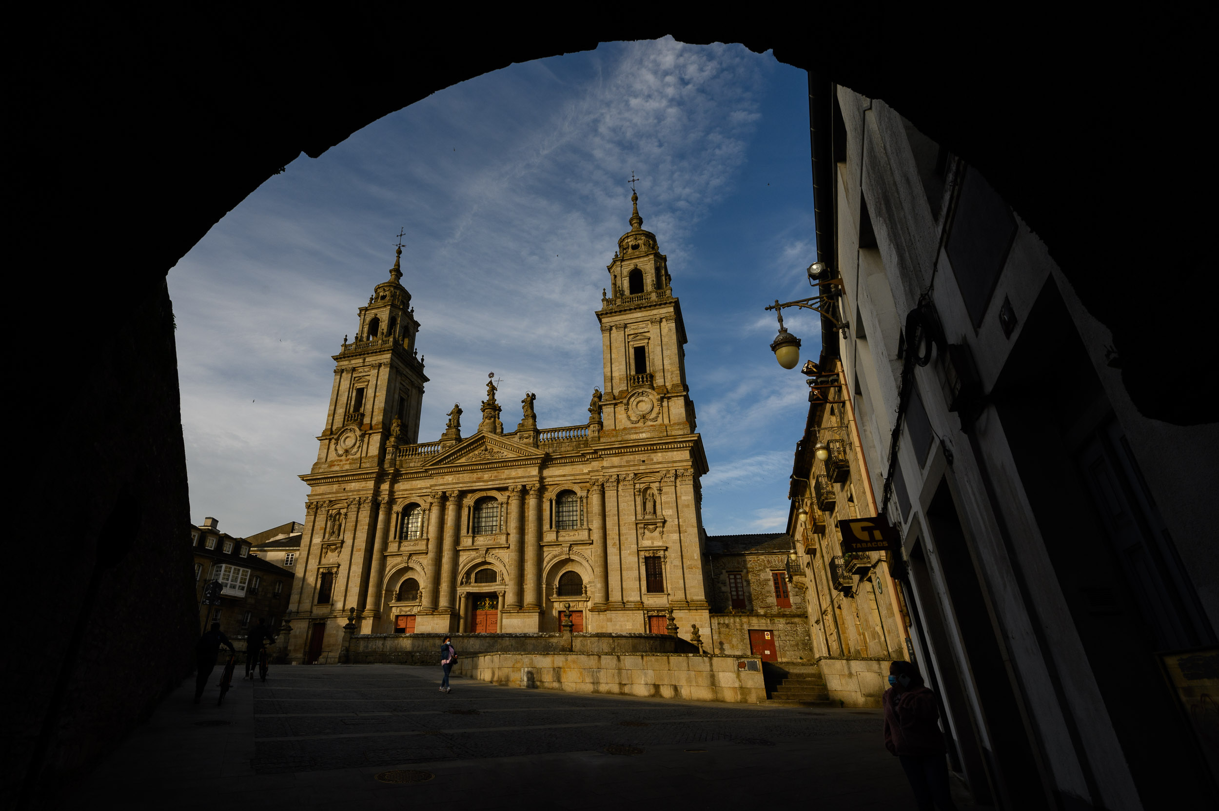 La fachada de la Catedral de Lugo, a través de una de las puertas de la muralla.