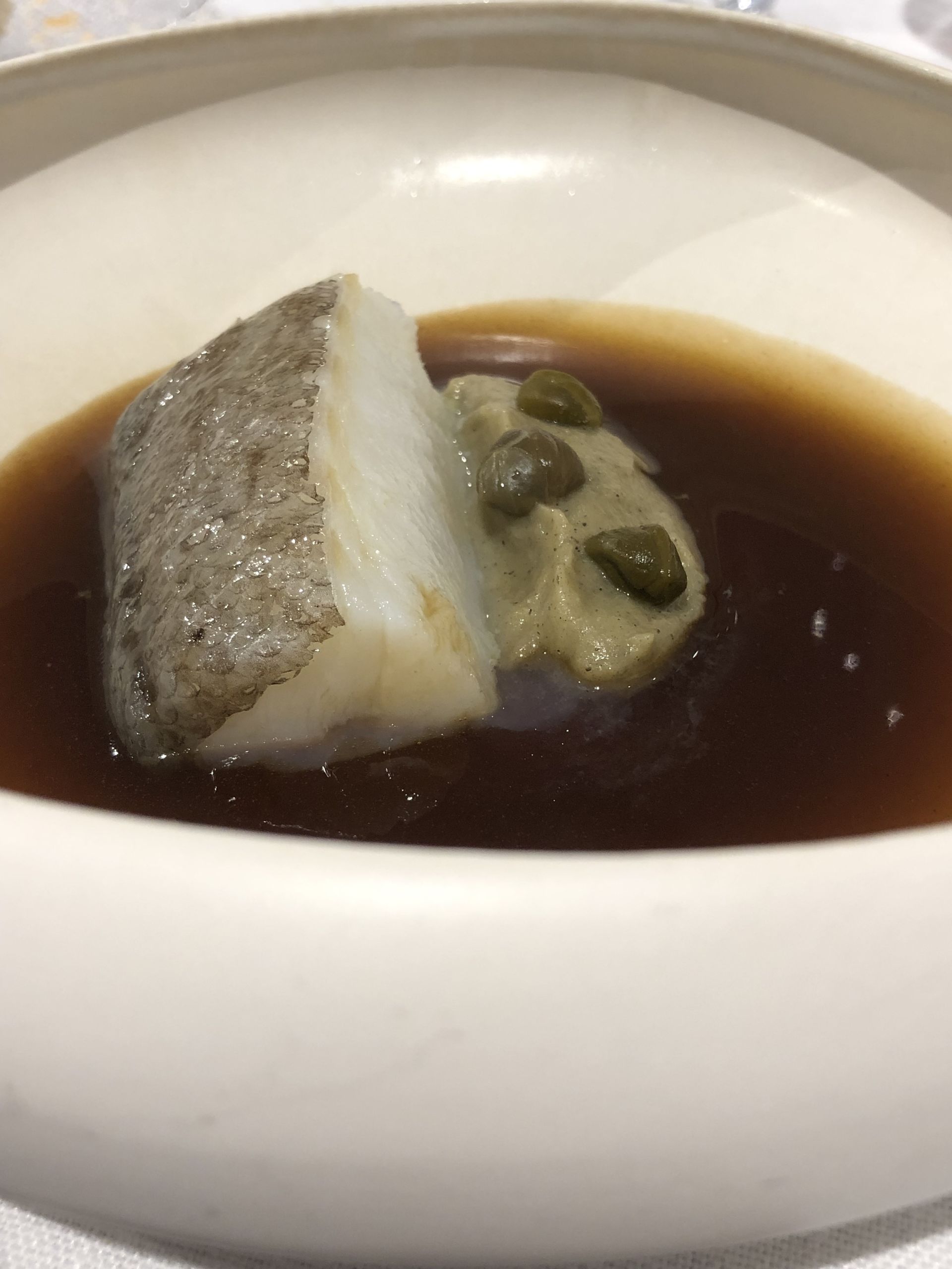 Ventresca de atún de Almadraba a la brasa con especias morunas, que se acompaña de una crema de berenjena con un caldo de zanguango con verduras.