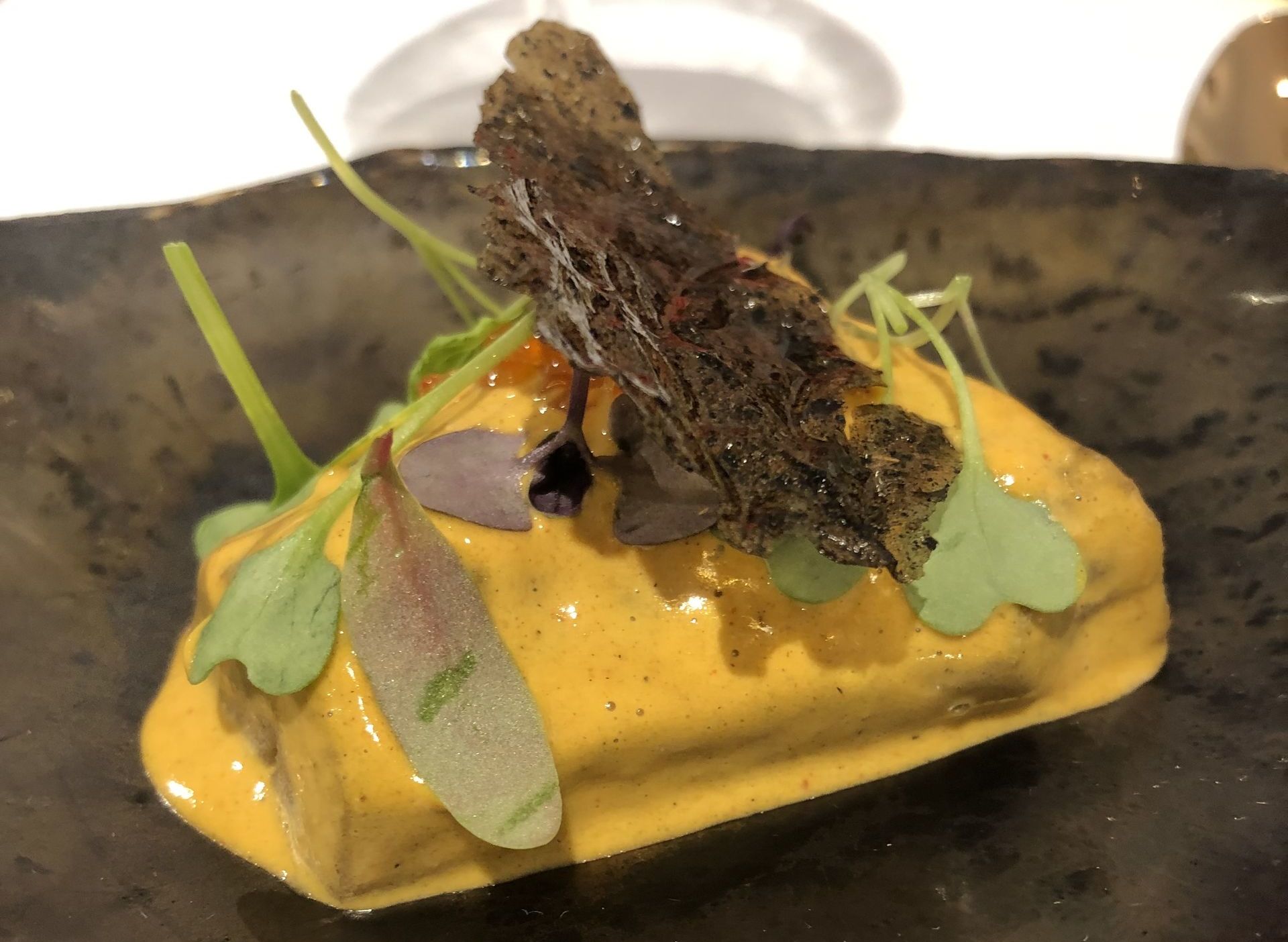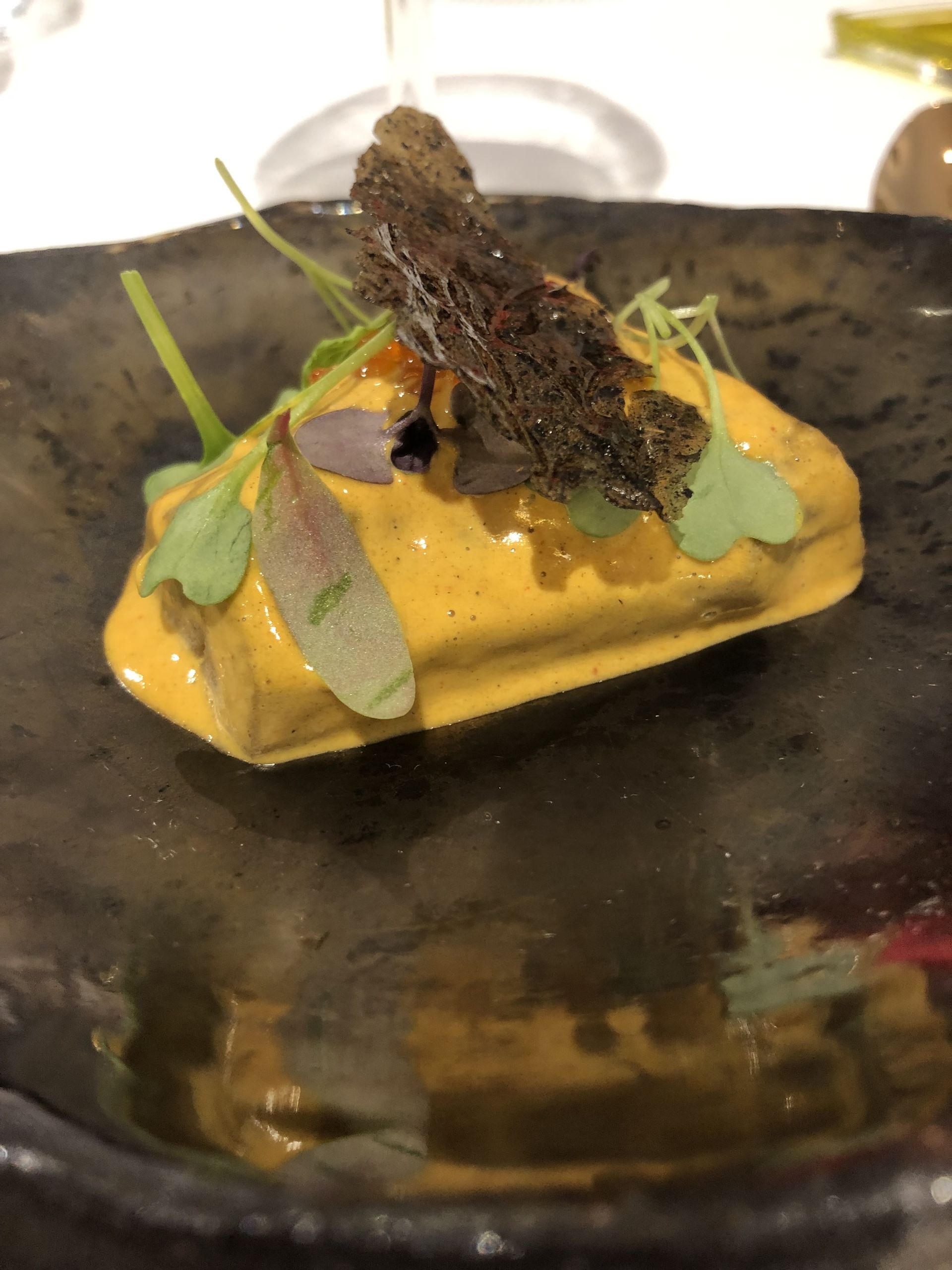 Berenjena en escabeche de mejillón y vainilla, que se acompaña de huevas de trucha y de un crujiente de la propia berenjena a la llama.