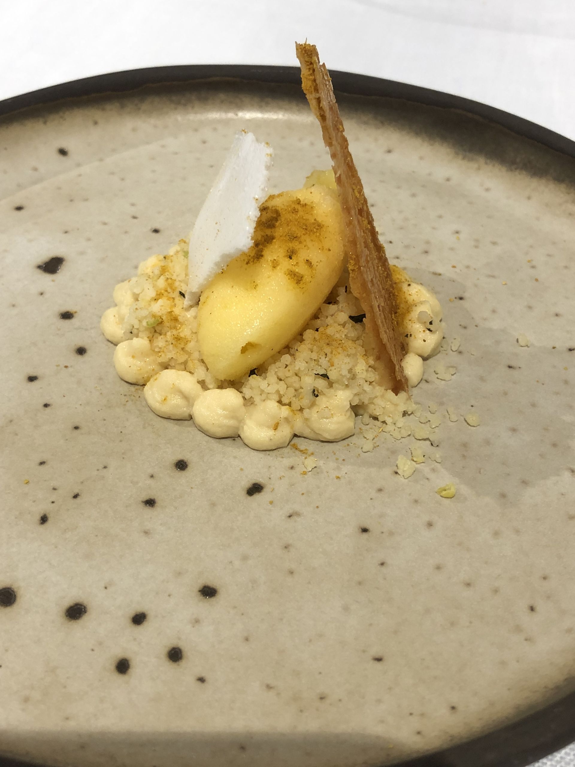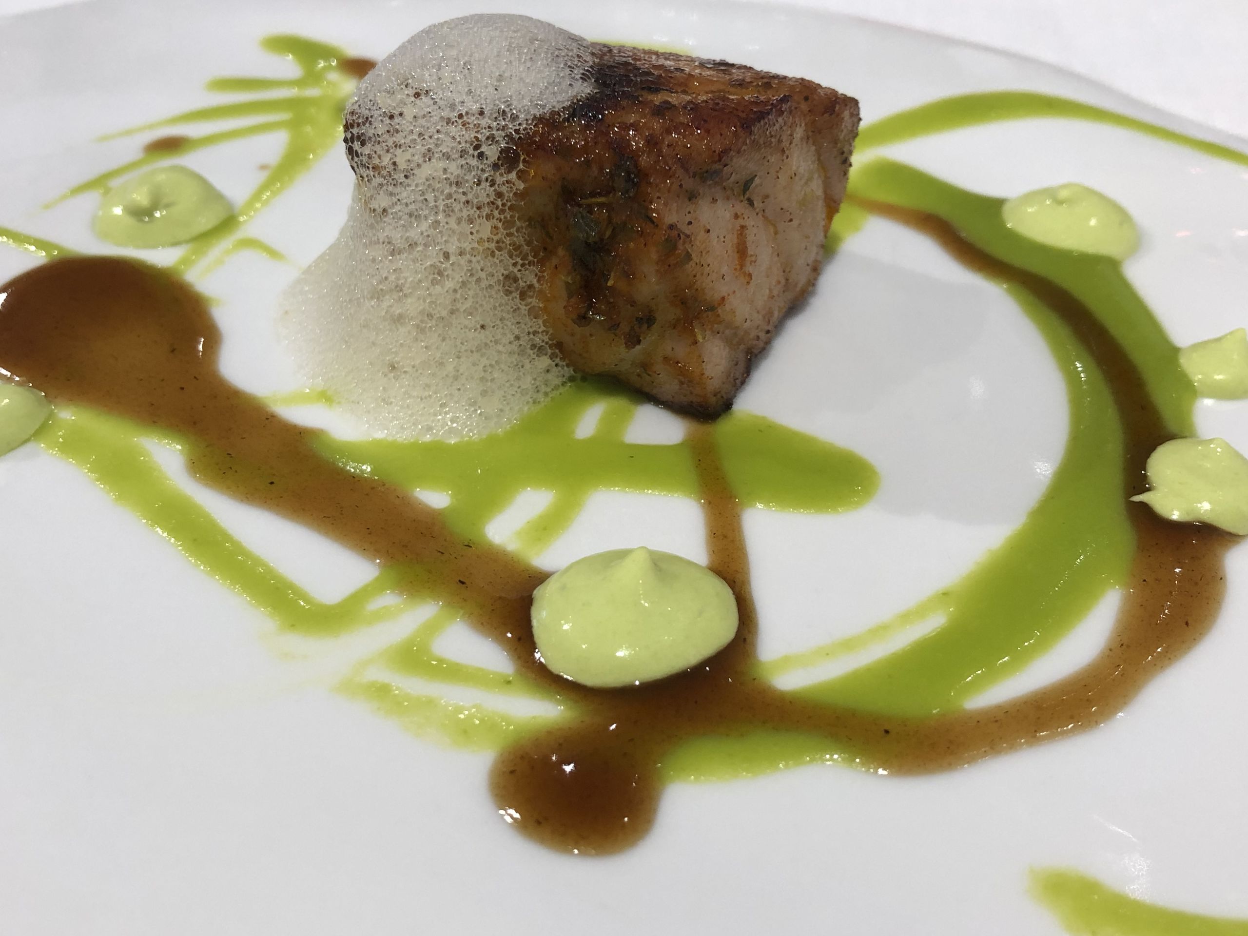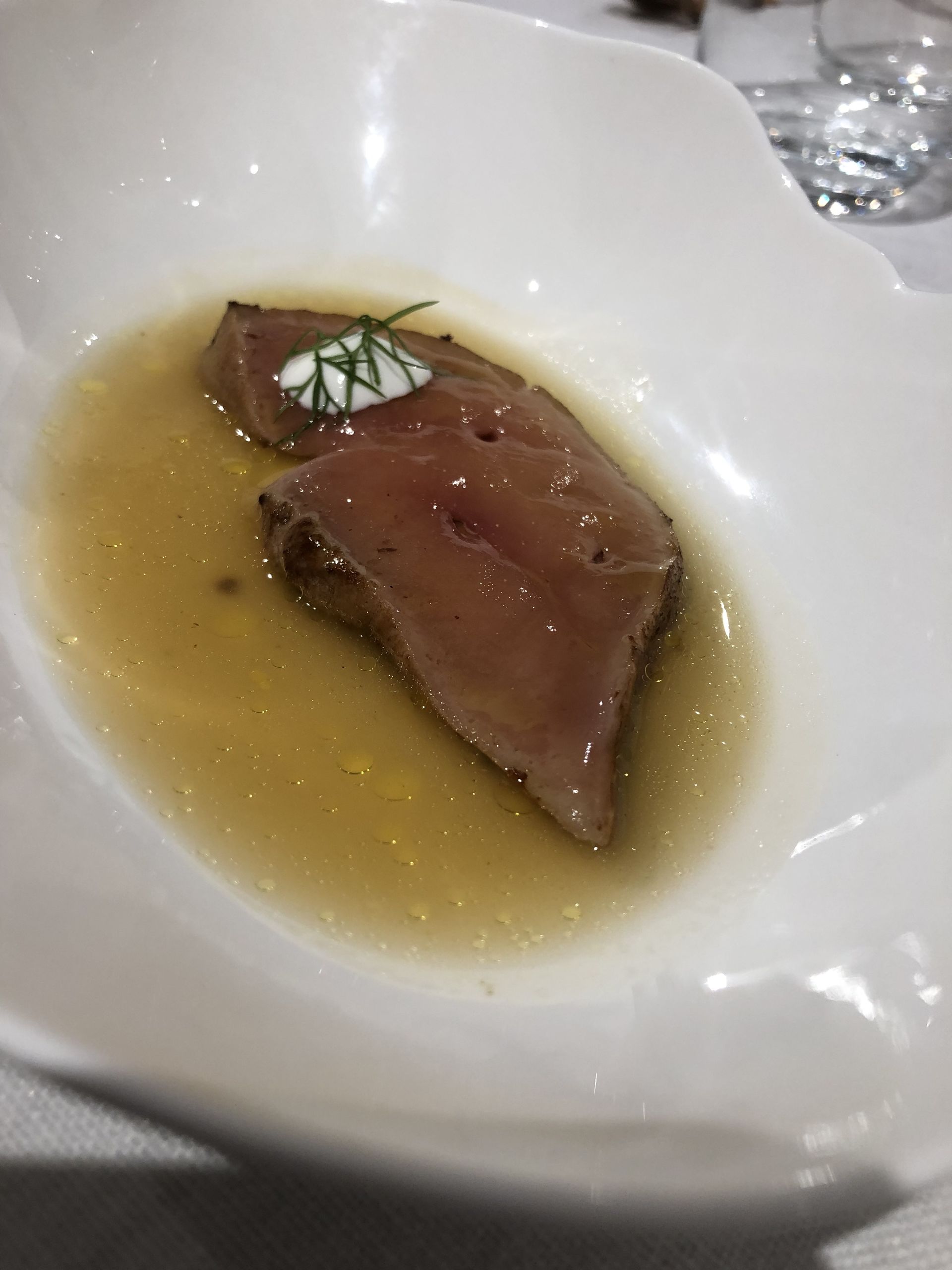 Foie de pato asado, acompañado de un original caldo de hierbaluisa y un toque de yogur.
